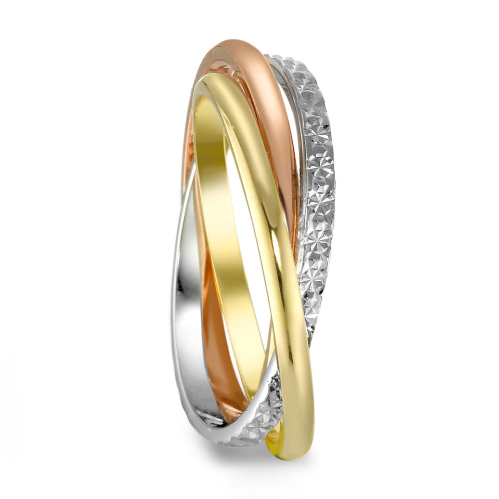 Eleganter Damen Fingerring aus 375er Gelbgold in zeitlosem Design. Die drei ineinander verschlungenen Ringe in Gelb-, Weiss- und Roségold verleihen diesem Schmuckstück besonderen Charme und Vielseitigkeit. Perfekt für jeden Anlass, modern und stilvoll zugleich.