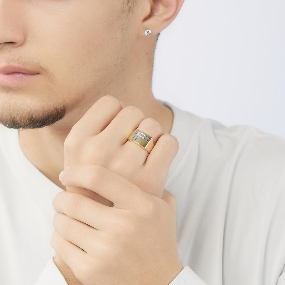 Eleganter Herrenring aus hochwertigem 375er Gelbgold mit feiner Weissgold-Akzentuierung. Der zeitlose Ring ist mit einem funkelnden Diamanten verziert und vereint maskuline Klarheit mit exklusivem Design – perfekt für stilbewusste Männer, die Wert auf Qualität und Eleganz legen.