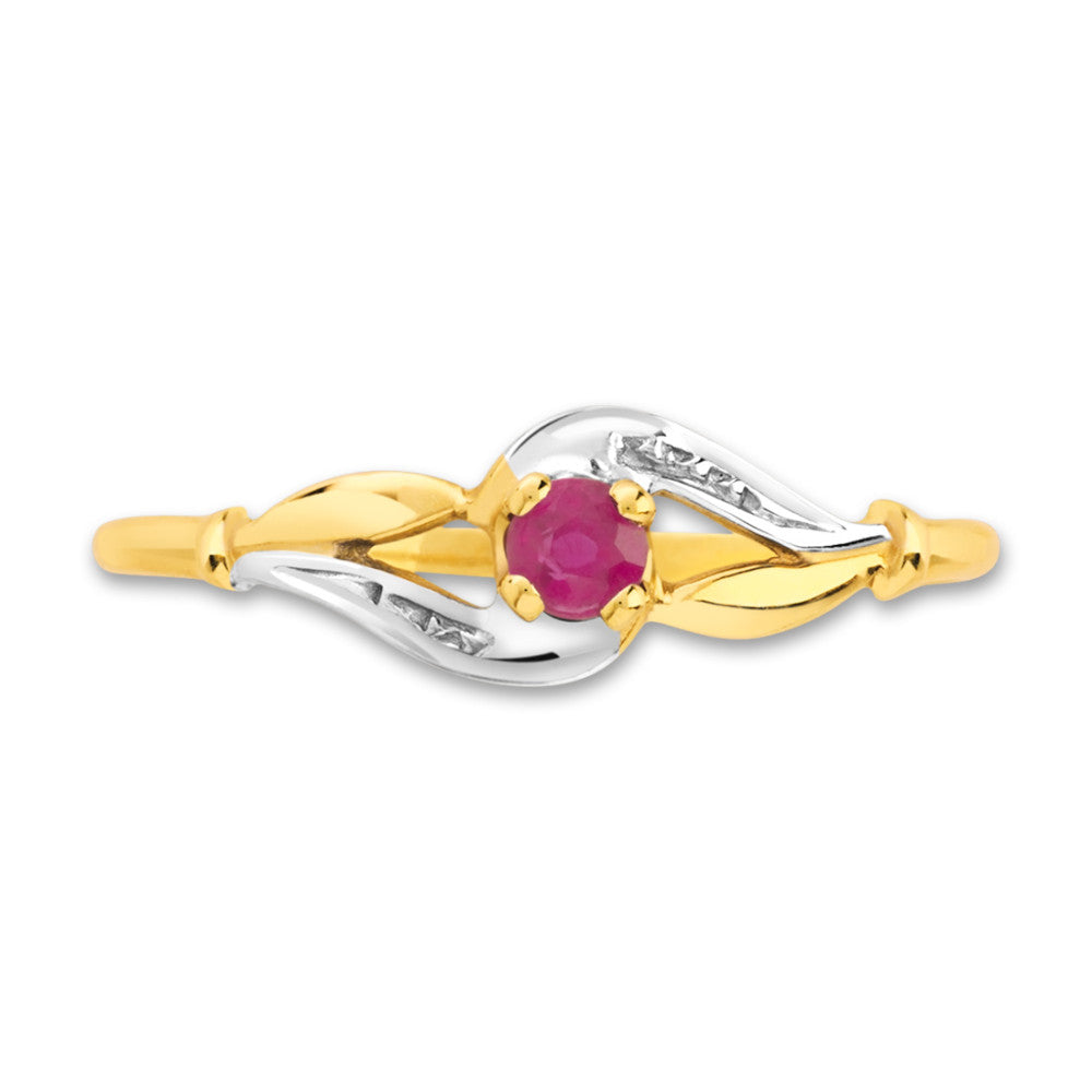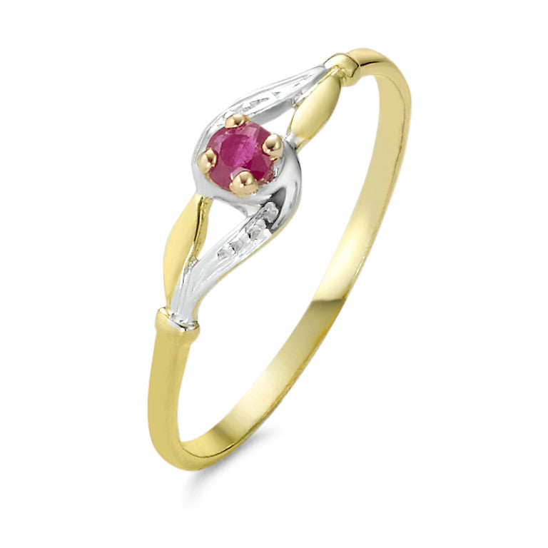 Eleganter Damenring aus 375er Gelbgold, verziert mit einem funkelnden Rubin. Das feine Design mit Weissgold-Akzenten macht diesen Fingerring zum perfekten Accessoire für jeden Anlass. Zeitlos schön und edel – ein Highlight für Ihre Schmucksammlung.