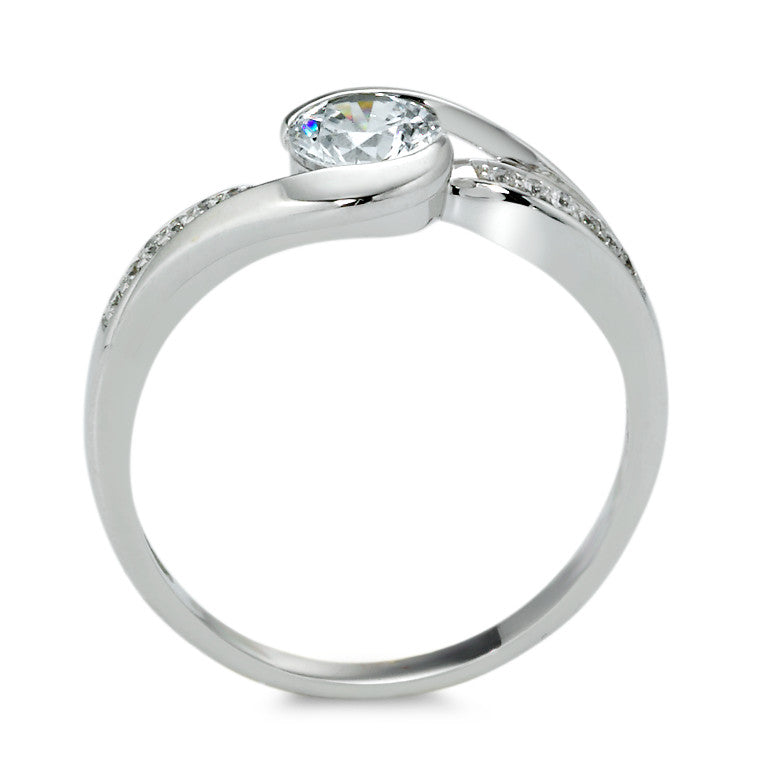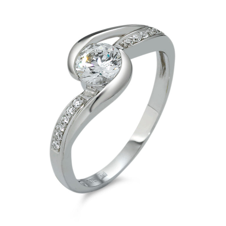 Eleganter Damenring aus 375er Weissgold mit funkelnden Zirkonia-Steinen. Der zentrale grosse Zirkonia wird von geschwungenem Design umrahmt, ergänzt durch kleinere Zirkonia entlang des Rings. Ein zeitloser und glänzender Begleiter für jeden Anlass.