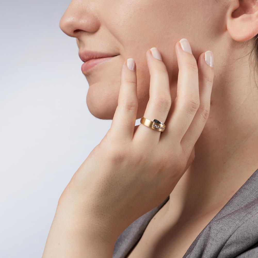 Eleganter Damenring aus 750er Gelbgold mit fünf funkelnden Zirkonia-Steinen in einer modernen, breiten Fassung. Das zeitlose Design verbindet edles Gold mit strahlendem Glanz – perfekt für jeden Anlass und als stilvolles Accessoire im Alltag. Ein Schmuckstück voller Charme und Qualität.