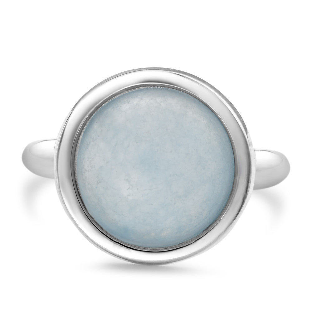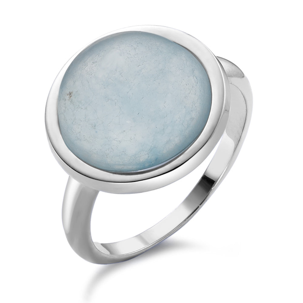 Eleganter Damenring aus 750er Weissgold, besetzt mit einem sanft schimmernden Chalcedon im Cabochon-Schliff. Das dezente Hellblau des Edelsteins harmoniert perfekt mit dem glänzenden Weissgold und verleiht Ihrem Look zeitlose Schönheit und Stil. Ideal für besondere Anlässe.