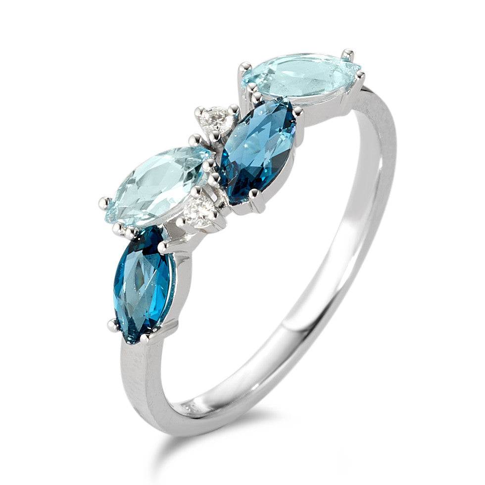 Eleganter Damen-Fingerring aus 750 Weissgold, verziert mit funkelnden Spitzen-Diamanten und strahlenden blauen Edelsteinen in Marquise-Schliff. Ein stilvolles Schmuckstück, das jedem Outfit einen Hauch von Luxus und Raffinesse verleiht. Perfekt für besondere Anlässe.