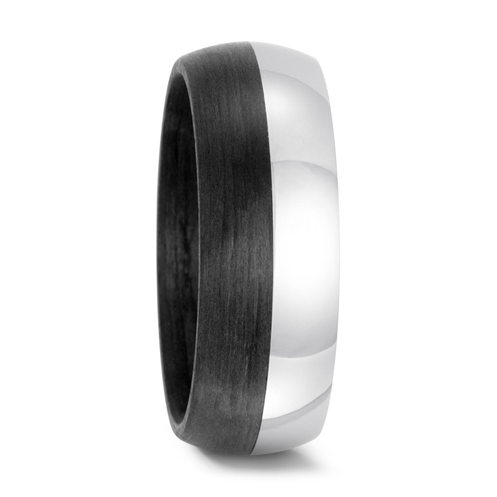 Moderner Herren Fingerring aus widerstandsfähigem Wolfram mit einer eleganten Carbon-Einlage. Die Kombination aus glänzendem Wolfram und mattem Carbon verleiht dem Ring eine markante, maskuline Optik. Hautfreundlich und besonders langlebig – ein echtes Statement am Finger.