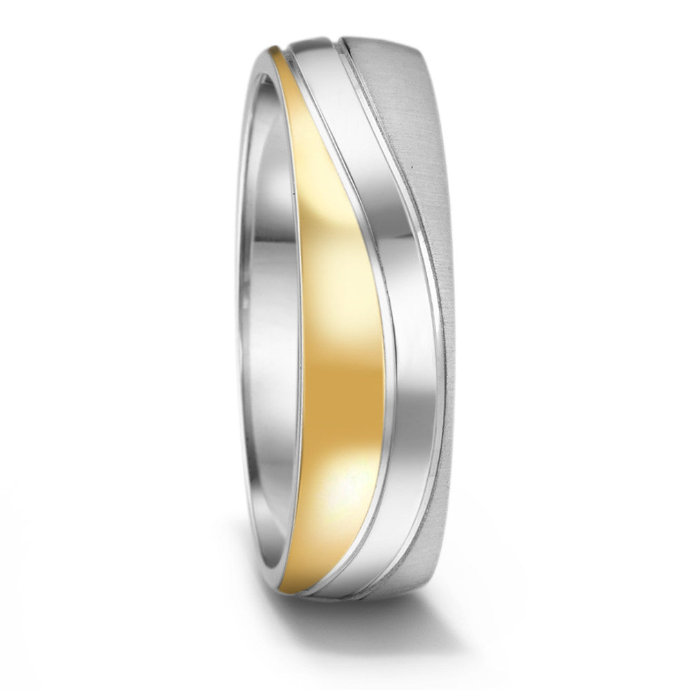 Moderner Herrenring aus hochwertigem Edelstahl mit trendiger zweifarbiger Optik in Silber und Gold. Das elegante Design mit mattem und glänzendem Finish macht den Fingerring zum idealen Accessoire für jeden Anlass. Robust, langlebig und hautfreundlich – perfekt für den modernen Mann.