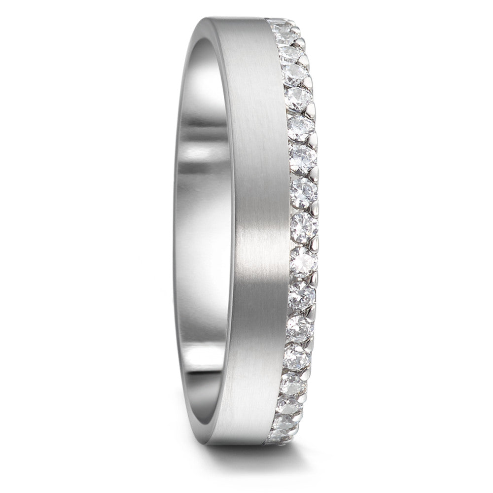 Eleganter Damen Fingerring aus robustem Edelstahl mit einer Reihe funkelnder Zirkonia-Steine. Das moderne, mattierte Design sorgt für zeitlose Eleganz und passt perfekt zu jedem Outfit. Ein langlebiges Schmuckstück, das Sie stilvoll begleitet – ideal als Geschenk oder für den eigenen Schmuckkasten.