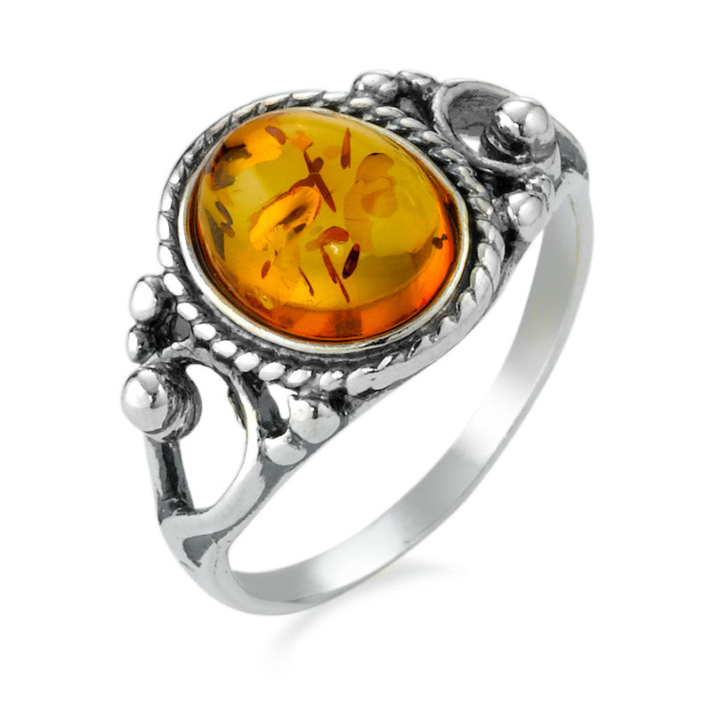 Eleganter Damen-Fingerring aus hochwertigem Silber, verziert mit einem warmen, leuchtenden Bernstein in Ovalform. Das filigrane Design mit kunstvollen Details macht diesen Schmuck zu einem zeitlosen Accessoire, das jedem Outfit eine natürliche und edle Note verleiht. Perfekt für besondere Anlässe oder den Alltag.