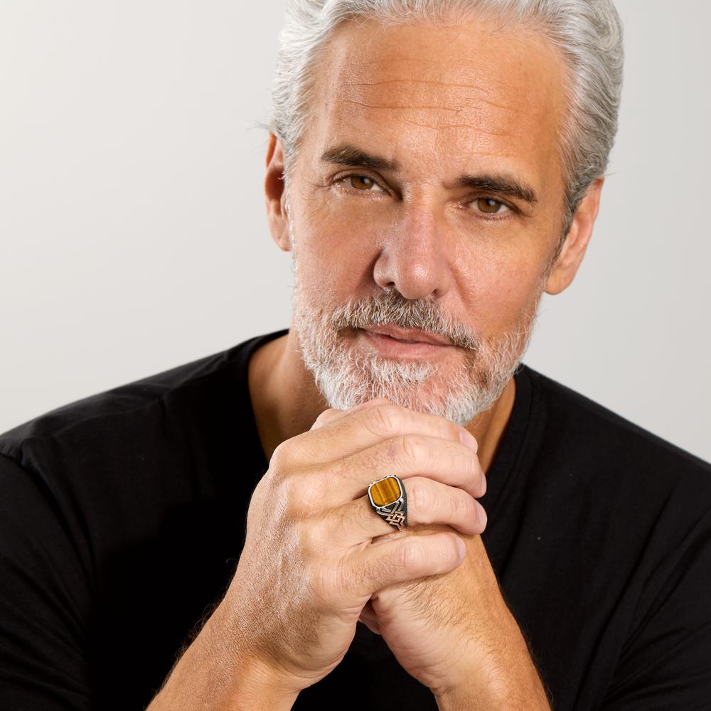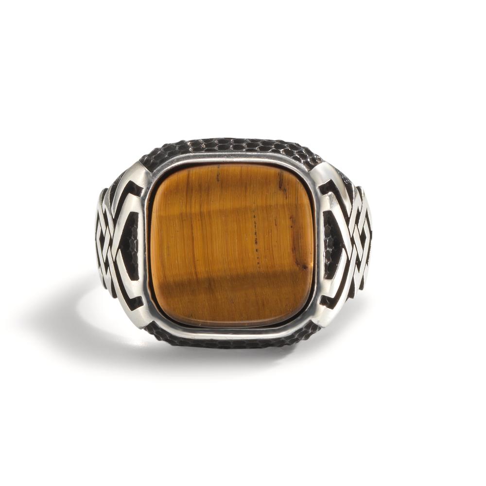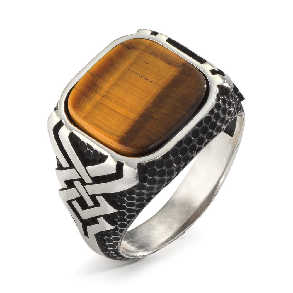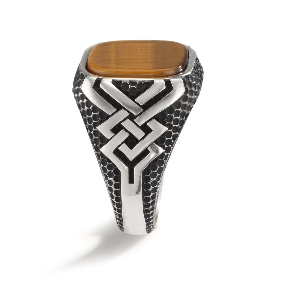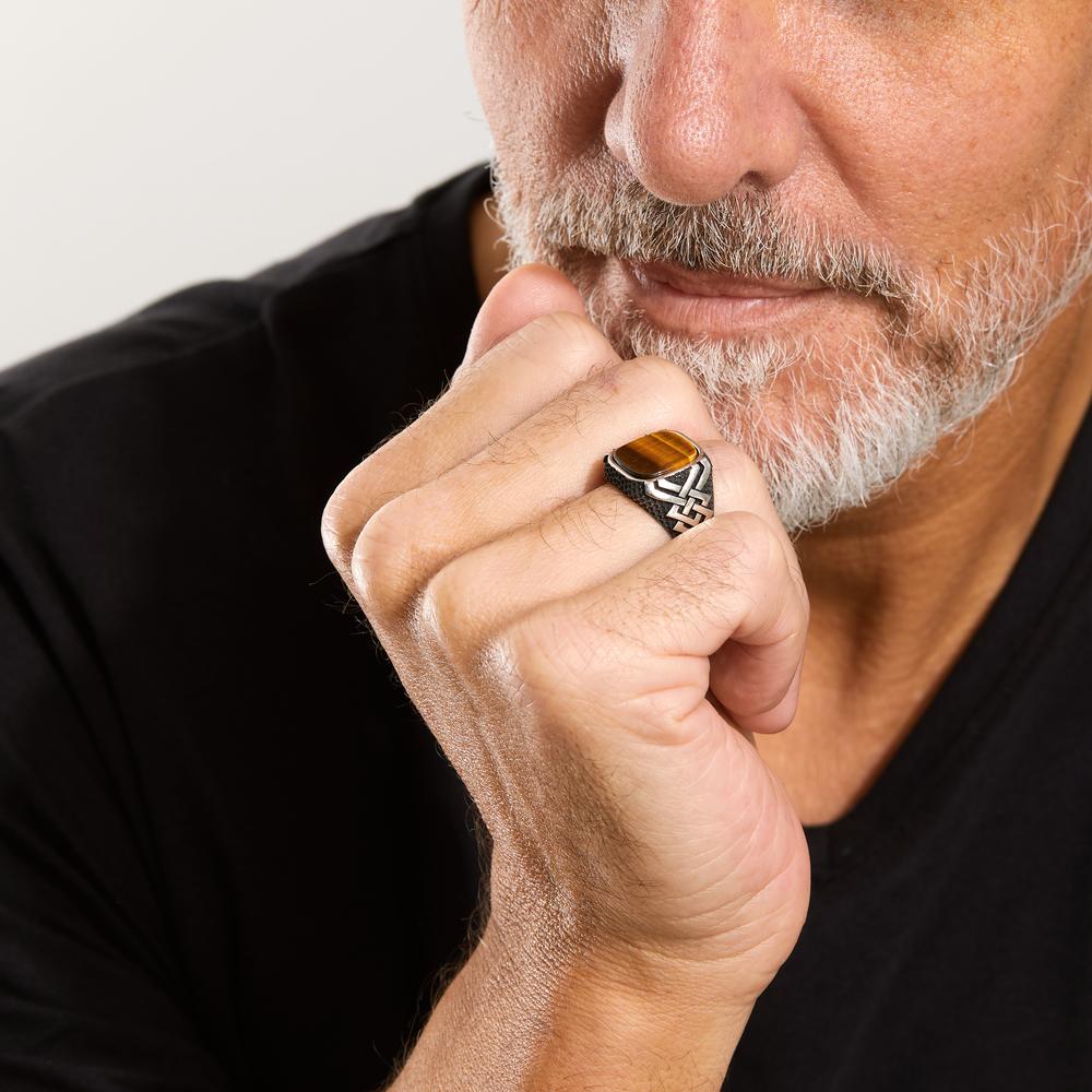Maskuliner Herrenring aus hochwertigem Silber mit einem eindrucksvollen Tigerauge als Blickfang. Die filigranen Muster und die antike Struktur verleihen dem Schmuckstück einen einzigartigen und kraftvollen Charakter. Perfekt für den stilbewussten Mann.