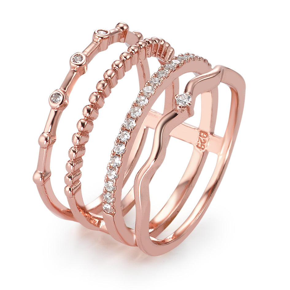 Eleganter Damenring aus hochwertigem Silber in angesagter Rosévergoldung. Drei filigrane Ringe in einem verbinden Zirkonia-Steine und raffinierte Formen zu einem modernen Look. Perfekt für stilbewusste Frauen, die dezenten Glamour lieben. Ein vielseitiges Schmuckstück für jeden Tag.