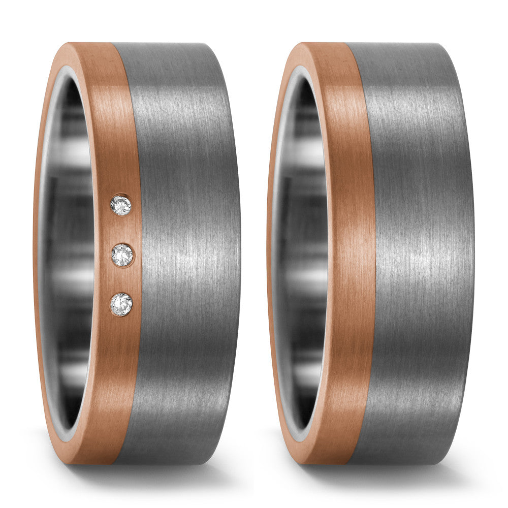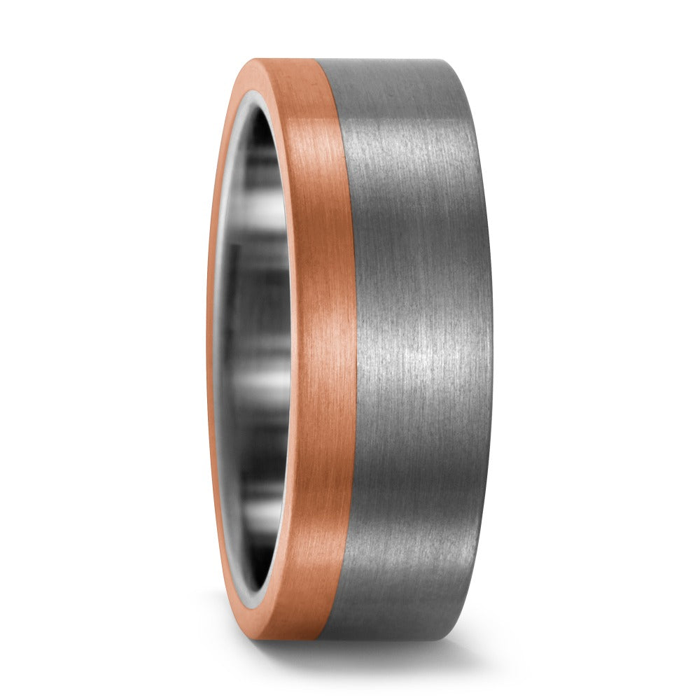 Moderner Damen-Fingerring aus robustem Titan kombiniert mit eleganten 750er Rotgold-Akzenten. Das matte Finish verleiht dem Schmuckstück einen stilvollen, zeitgemässen Look. Ideal für den Alltag oder besondere Anlässe – langlebig, leicht und hautfreundlich.
