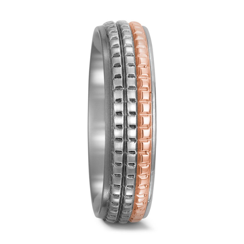 Moderner Herrenring aus robustem Titan, kombiniert mit edlem 750er Rotgold. Das markante Rillenmuster verleiht dem Ring einen maskulinen und zugleich eleganten Look. Ideal für stilbewusste Männer, die auf hochwertige Materialien und aussergewöhnliches Design setzen.