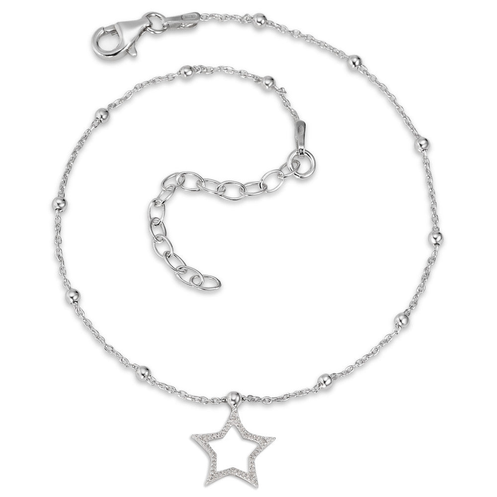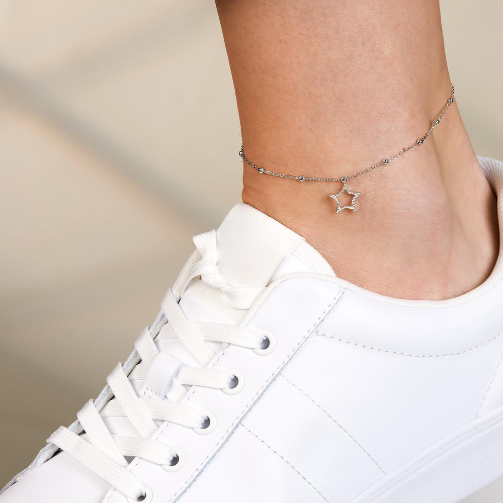 Dieses elegante Damen-Fusskettchen aus hochwertigem Silber besticht durch zarte Glieder mit kleinen silbernen Kugeln und einen filigranen Stern-Anhänger. Verstellbare Länge sorgt für perfekten Sitz. Ein stilvolles Accessoire für jeden Anlass im Sommer und darüber hinaus.