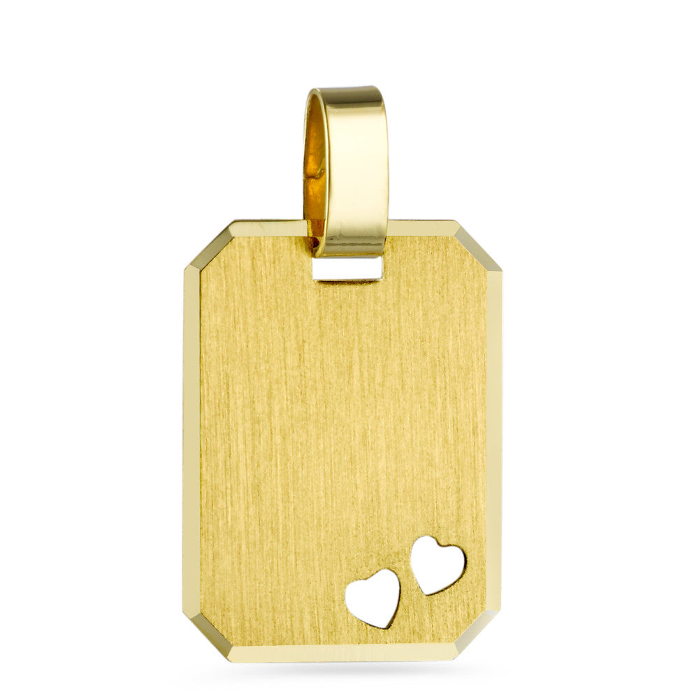 Eleganter Gravuranhänger aus 375 Gelbgold mit zwei liebevoll ausgeschnittenen Herzmotiven. Die matte Oberfläche und die facettierten Kanten verleihen dem Schmuckstück eine besondere Note. Ideal zum Personalisieren und als besonderes Geschenk für Ihre Liebsten.
