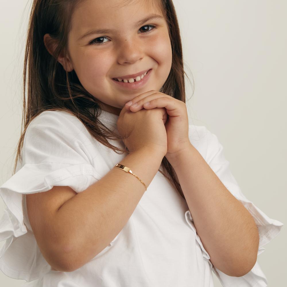 Dieses süsse Gravurarmband aus 375/9 K Gelbgold mit Herzeinhänger ist ein wundervolles Schmuckstück für Babys und Kinder, das bleibende Erinnerungen schafft. Mit einer Gesamtlänge von 14 cm und einer Zwischenöse bei 12 cm wächst das Armband vom Baby bis zum Kindesalter mit. Die beidseitig gravierbare Goldplatte ermöglicht individuelle Gestaltung. Ein zeitloses Geschenk zur Geburt oder Taufe, das Sicherheit, Eleganz und Stil vereint.