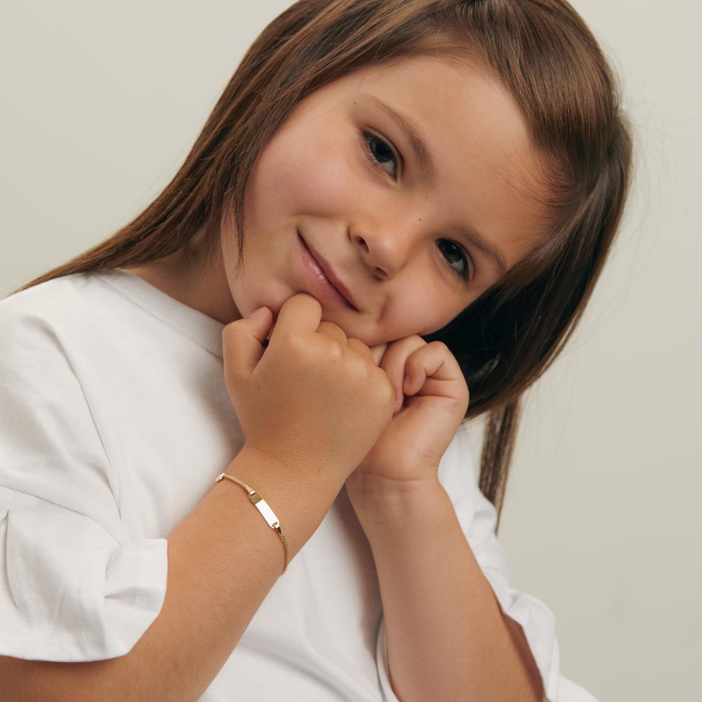 Dieses zarte Baby-Gravurarmband aus hochwertigem 585er Gelbgold ist das perfekte Geschenk zur Taufe oder Geburt. Die feine Panzerkette trägt eine rechteckige Platte zum Personalisieren sowie ein süsses Herz als Anhänger. Ein zeitloses Schmuckstück voller Liebe.