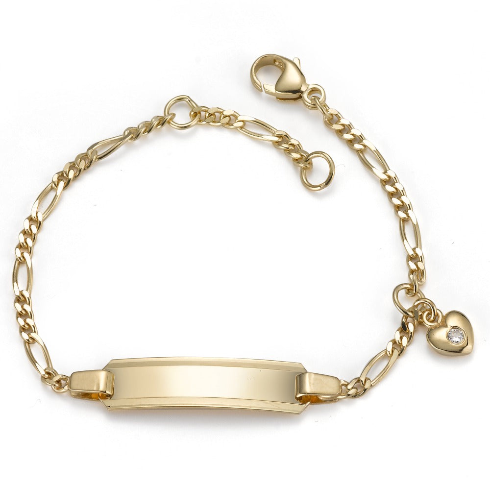 Dieses zarte Baby Gravurarmband aus hochwertigem 585 Gelbgold besticht durch eine elegante Figaro-Kette und ein kleines Herz mit funkelndem Zirkonia. Die gravierbare Platte macht es zum perfekten personalisierten Geschenk für Ihr Baby. Sicherer Karabinerverschluss inklusive.