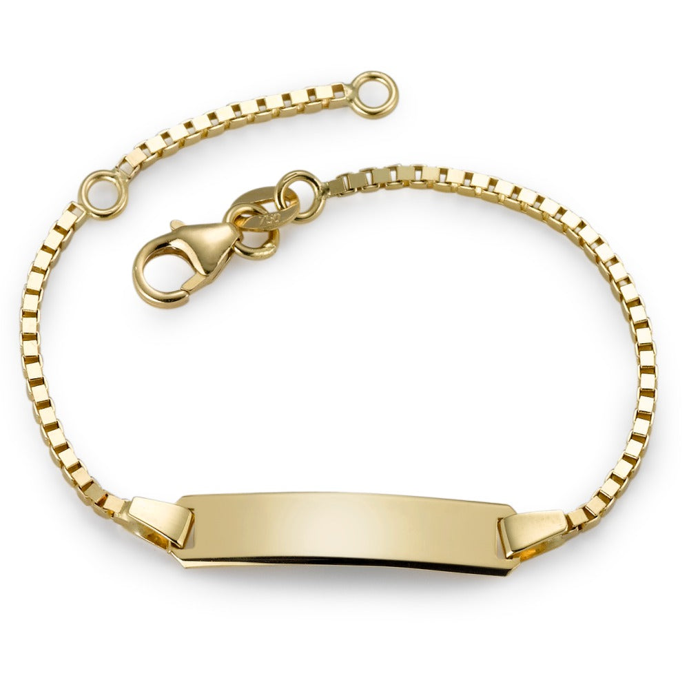 Wunderschönes Babygravierarmband aus hochwertigem 750er Gelbgold. Das filigrane Design mit glänzender Platte ist perfekt für eine individuelle Gravur und macht dieses Armband zu einem besonderen Geschenk für Ihr Kind. Sicherer Karabinerverschluss für bequemen Halt.