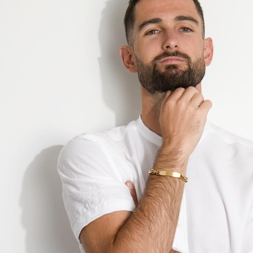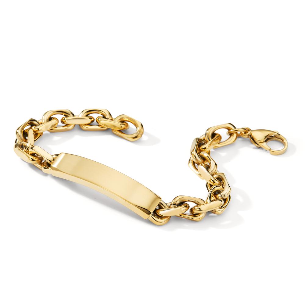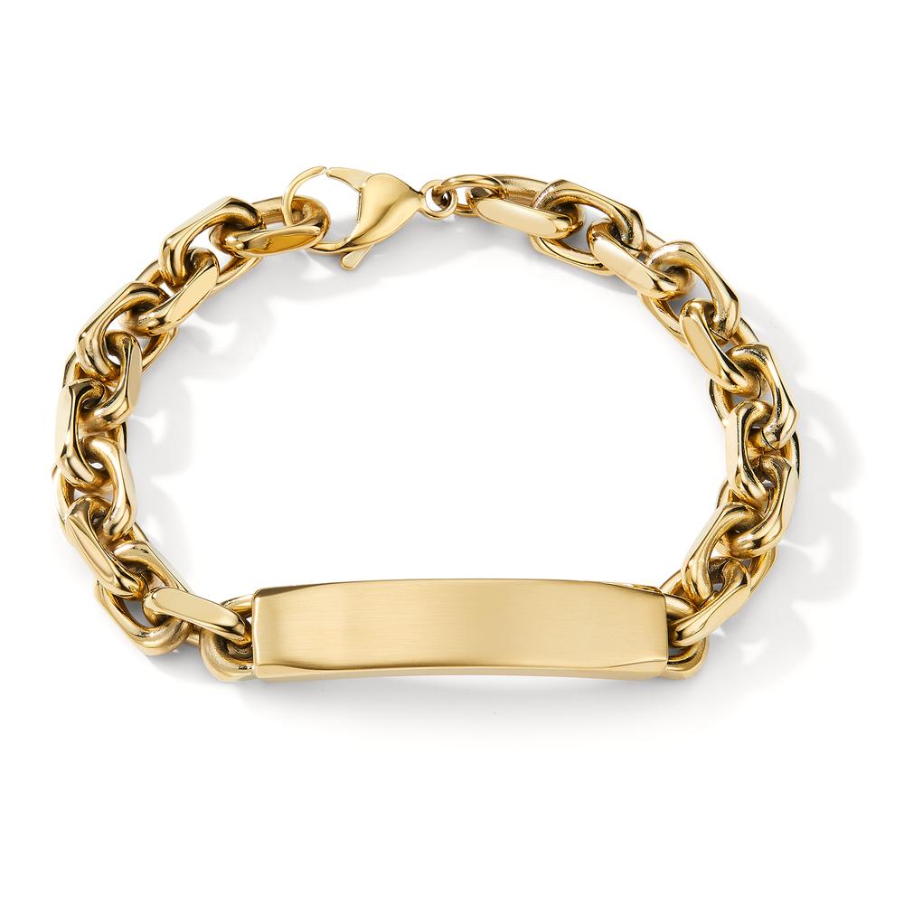 Stilvolles Herren-Gravurarmband aus hochwertigem Edelstahl mit goldfarbener Beschichtung. Das robuste Gliederdesign verleiht maskulinen Charme, während die personalisierbare Gravurplatte Raum für individuelle Botschaften bietet. Ideal als Geschenk oder modisches Accessoire.