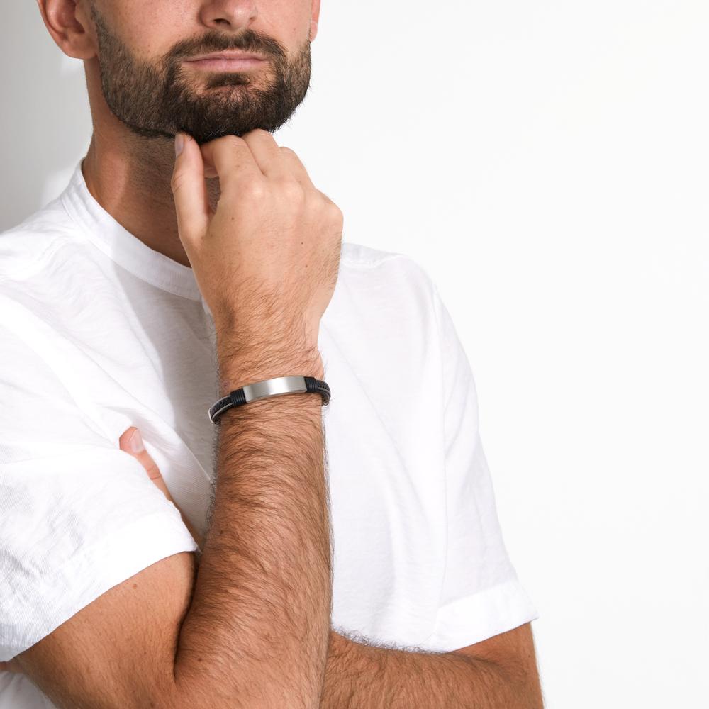 Stilvolles Herren-Armband aus robustem Edelstahl und hochwertigem Kunstleder. Das Armband besticht durch seine moderne, doppelte Riemenoptik und die matte Gravurplatte, die individuell beschriftbar ist. Perfekt für einen maskulinen Look mit persönlicher Note.