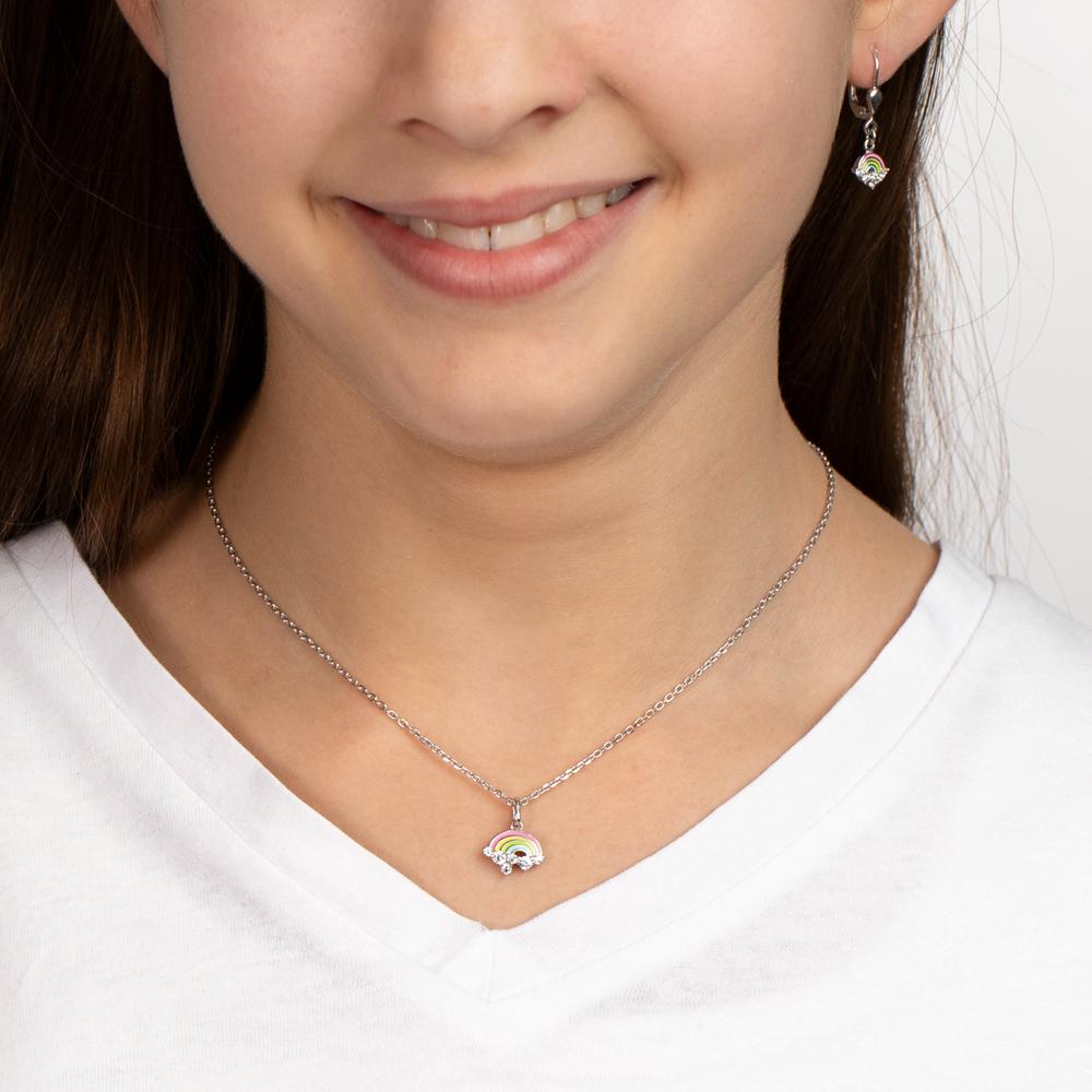 Zauberhafte Mädchencollier aus feinem Silber mit farbenfrohem Regenbogen-Anhänger. Funkelnde Zirkonia-Steine verleihen dem Schmuckstück einen besonderen Glanz. Perfekt als Geschenk oder für kleine Träume – ein eleganter Begleiter für jeden Tag und besondere Momente.