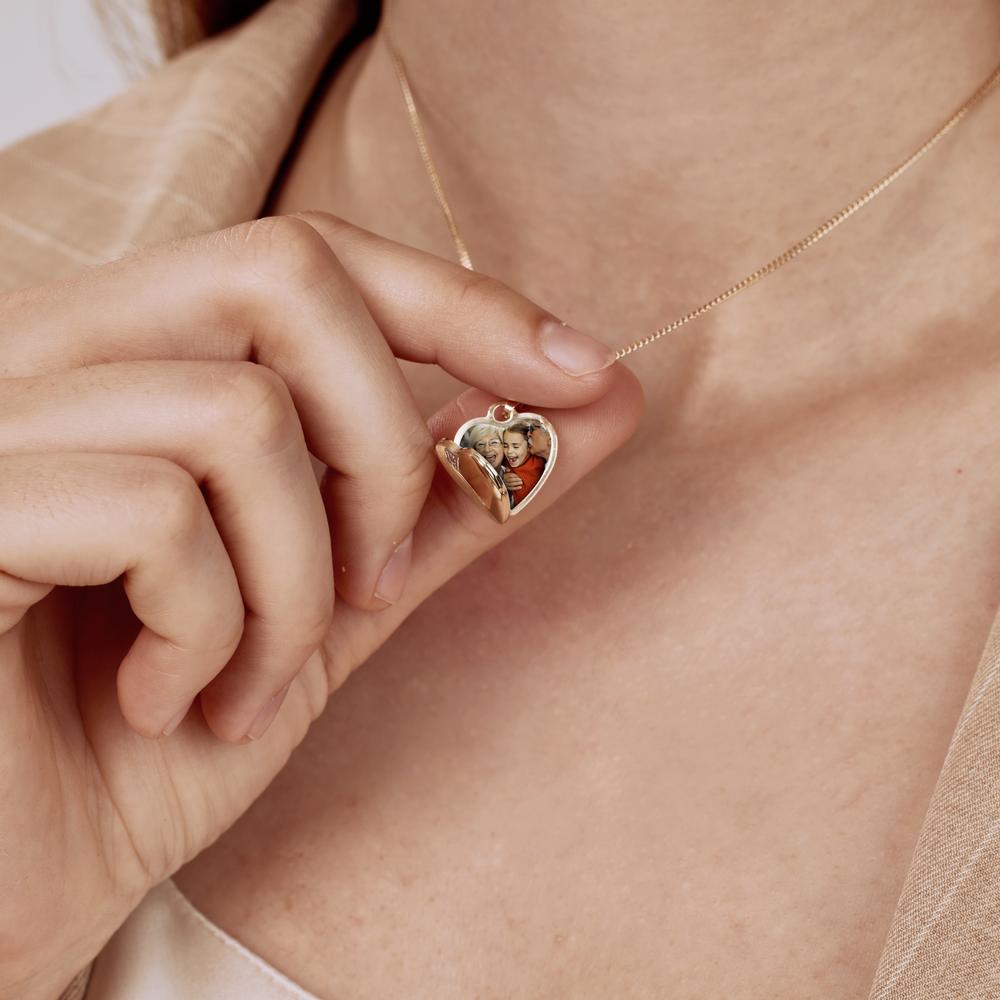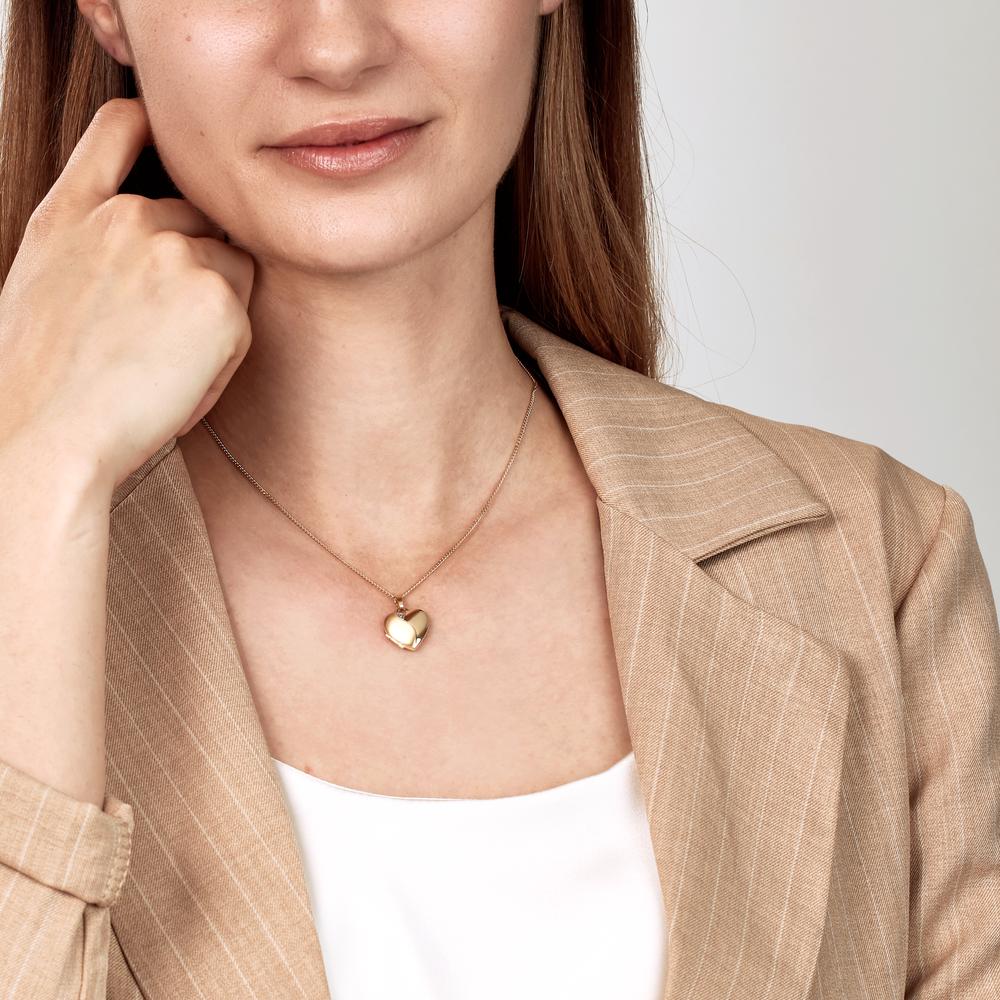 Elegantes Damen-Medaillon in Herzform aus hochwertigem 375er Gelb- und Weissgold. Die Kombination aus matten und polierten Flächen sowie das dezente Weissgold-Detail verleihen dem Schmuckstück einen zeitlosen Charme. Ideal für persönliche Fotos oder kleine Erinnerungen.