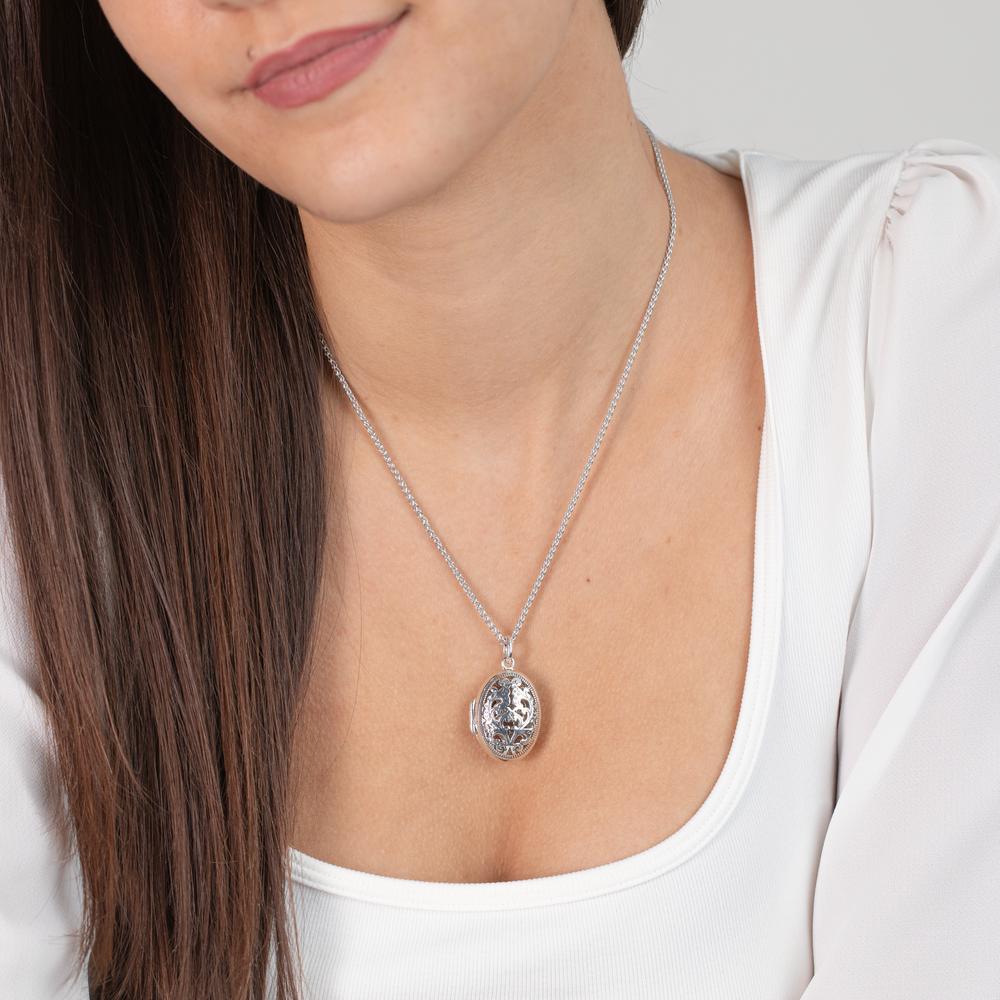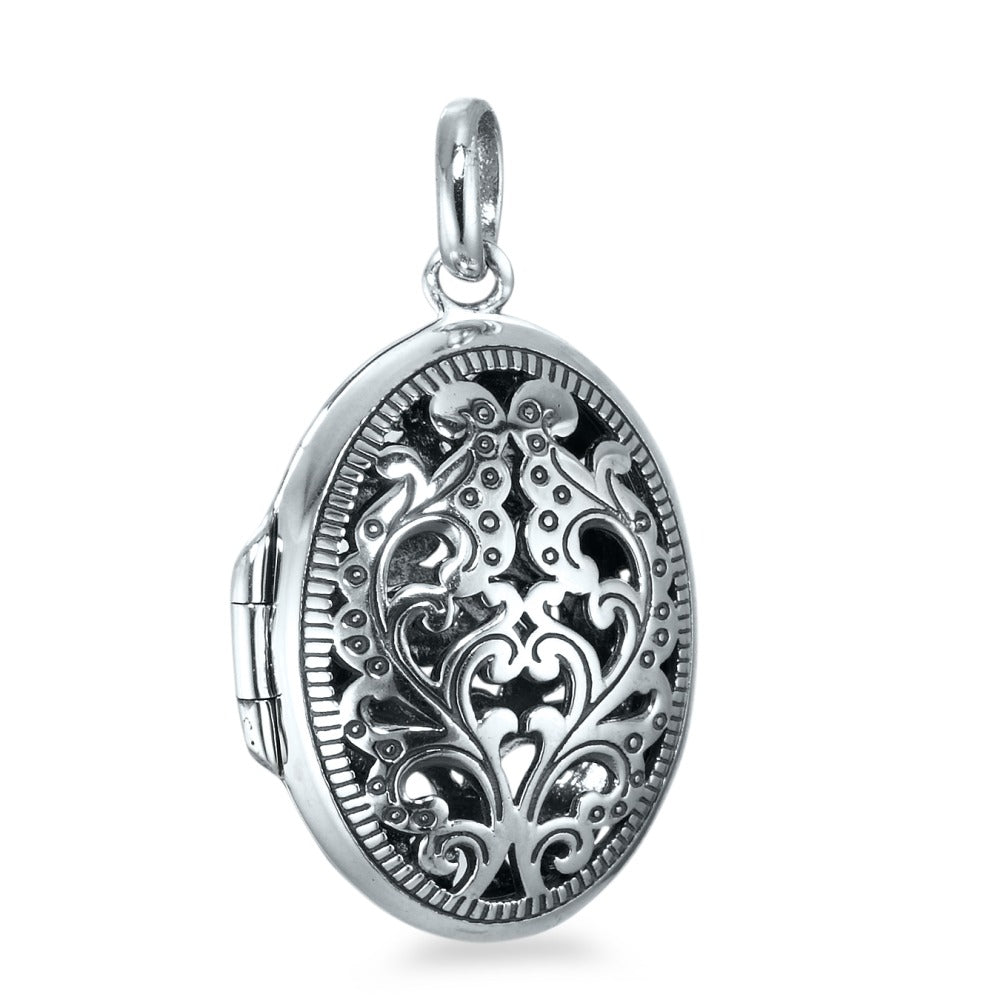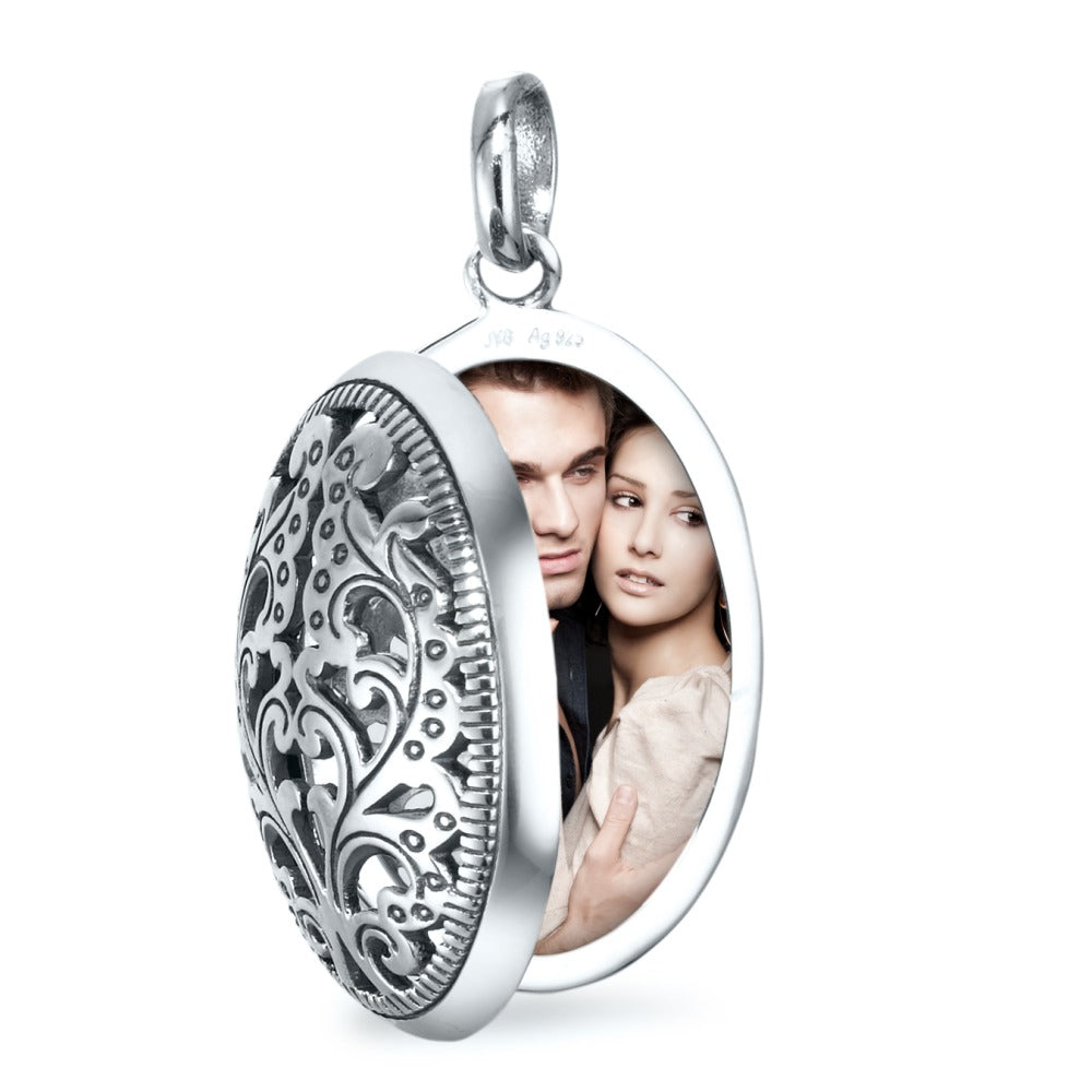 Elegantes Damen Medaillon aus hochwertigem Silber mit filigranem Ornament-Design. Perfekt, um persönliche Erinnerungen nah am Herzen zu tragen. Zeitloser Schmuck, der jedem Outfit einen edlen Akzent verleiht. Ein Schmuckstück mit emotionalem Wert und stilvoller Ausstrahlung.