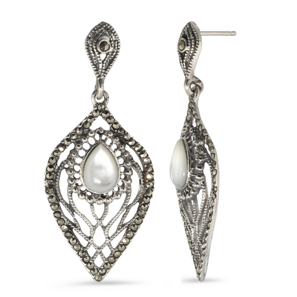 Diese eleganten Damen-Ohrhänger aus Silber begeistern mit funkelnden Markasit-Steinen und einer zarten Tropfen-Perle im Zentrum. Das filigrane Design verleiht jedem Outfit einen edlen, zeitlosen Look – perfekt für besondere Anlässe oder den stilvollen Alltag.