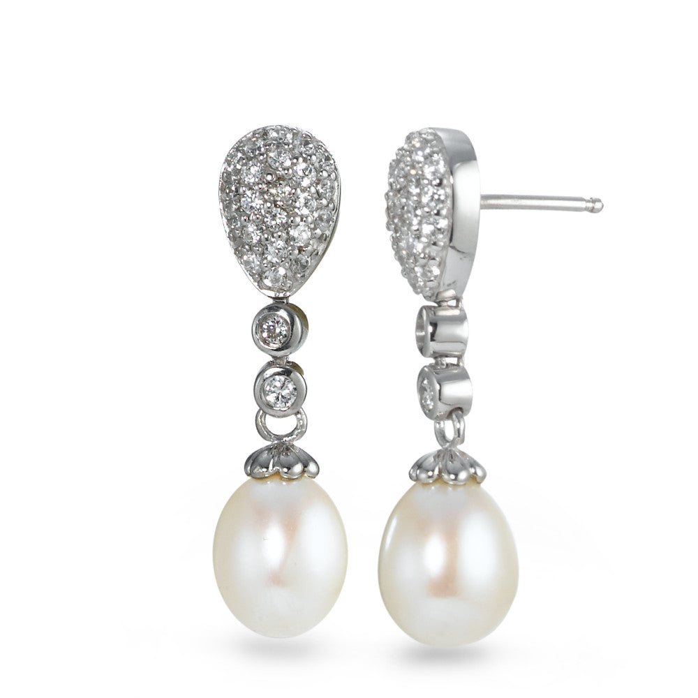 Elegante Damen-Ohrhänger aus hochwertigem Silber mit funkelnden Zirkonia-Steinen und zarten, weissen Perlen. Das zeitlose Design verleiht jedem Look eine besondere Note und macht die Ohrringe zum perfekten Accessoire für festliche Anlässe oder den Alltag.