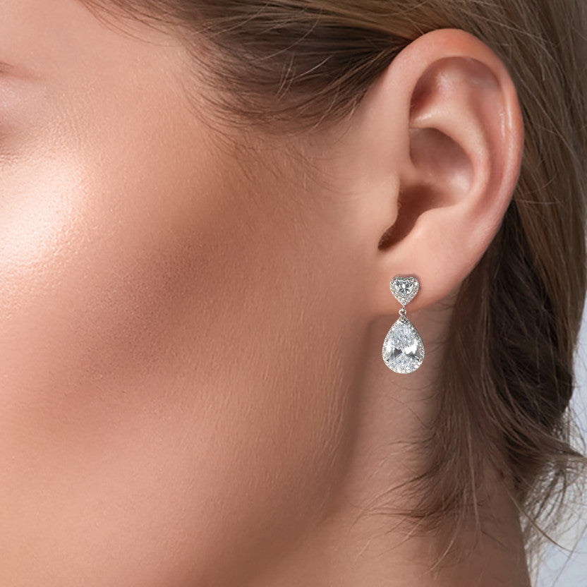 Elegante Damen-Ohrhänger aus hochwertigem Silber, verziert mit funkelnden Zirkonia-Steinen. Das Design kombiniert ein strahlendes Herz mit einem grossen, tropfenförmigen Anhänger – ein zeitloser Schmuckklassiker für jeden Anlass, der Glamour und Romantik perfekt vereint.