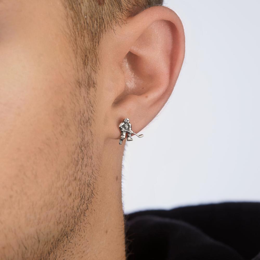 Sportlich und stilvoll: Dieser Herren Ohrstecker aus hochwertigem Silber zeigt einen Eishockeyspieler in Aktion. Perfekt für alle Fans und Spieler des schnellen Sports, die ein dezentes, aber aussagekräftiges Accessoire suchen. Ein Einzelstück für besondere Akzente.