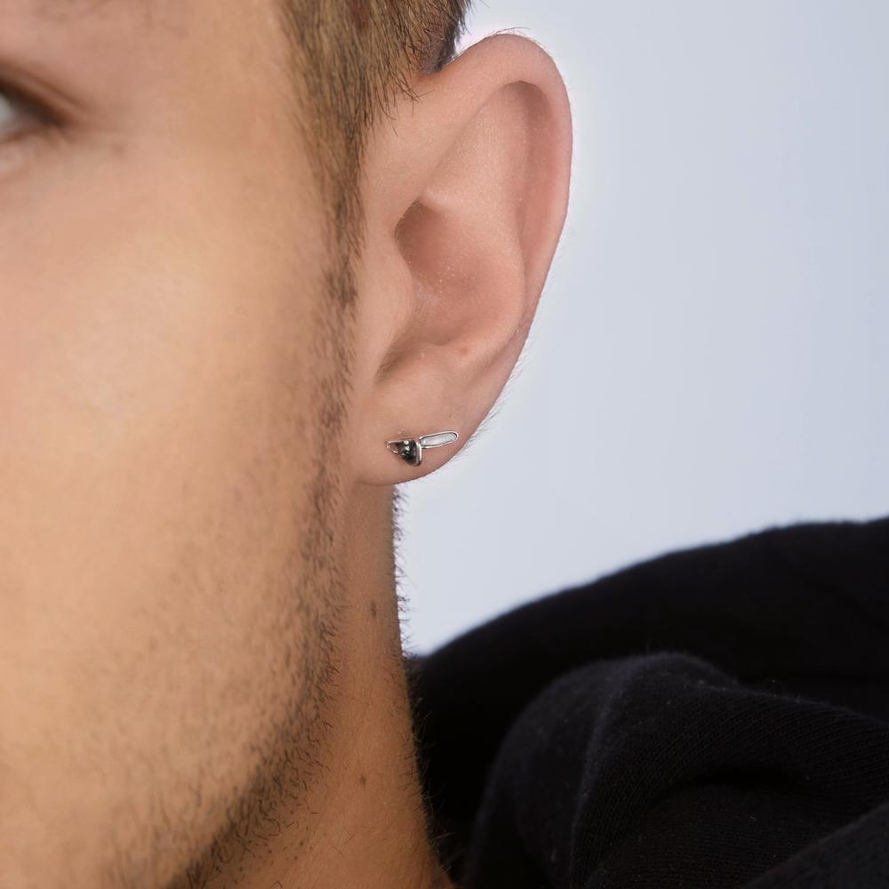 Stylischer Herren Ohrstecker aus hochwertigem Silber, designet als kleine Motorsäge. Ein originelles Accessoire für Männer, die robuste und individuelle Schmuckstücke lieben. Einzelstück für einen markanten Look im Alltag oder zu besonderen Anlässen.