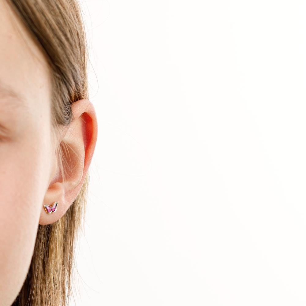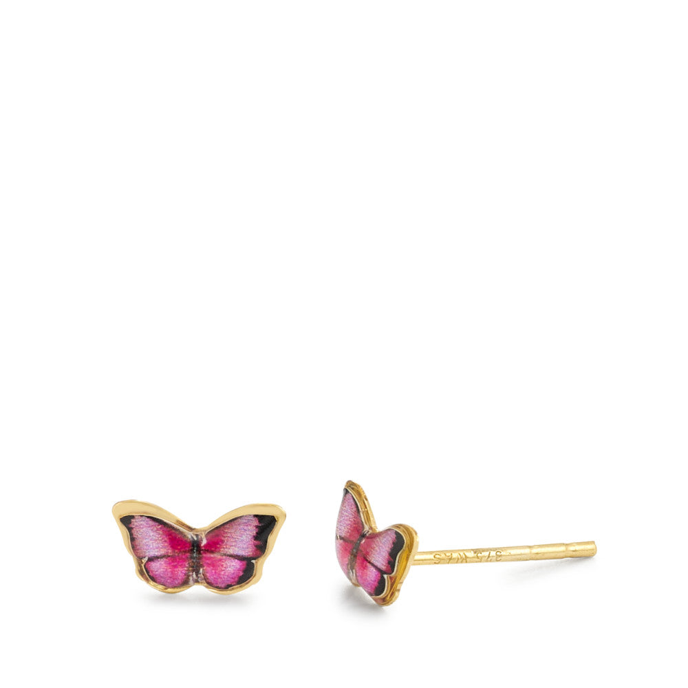Zarte Mädchen-Ohrstecker aus 375er Gelbgold in Schmetterlingsform. Die liebevoll gestalteten Schmetterlinge sind rosa emailliert und verleihen jedem Outfit verspielten Charme. Ein zauberhaftes Schmuckstück für kleine Trägerinnen mit edlem Glanz und hoher Qualität.