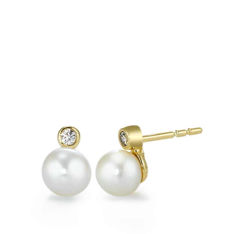 Elegante Damen-Ohrstecker aus 750er Gelbgold, verziert mit funkelnden Zirkonia und einer edlen weissen Perle. Ein zeitloser und stilvoller Begleiter für jeden Anlass, der jedem Outfit einen Hauch von Luxus verleiht. Leicht und angenehm zu tragen, ideal als Geschenk oder für den eigenen Schmuckschatz.