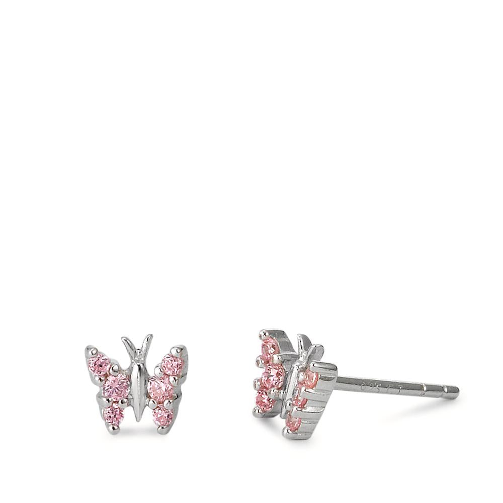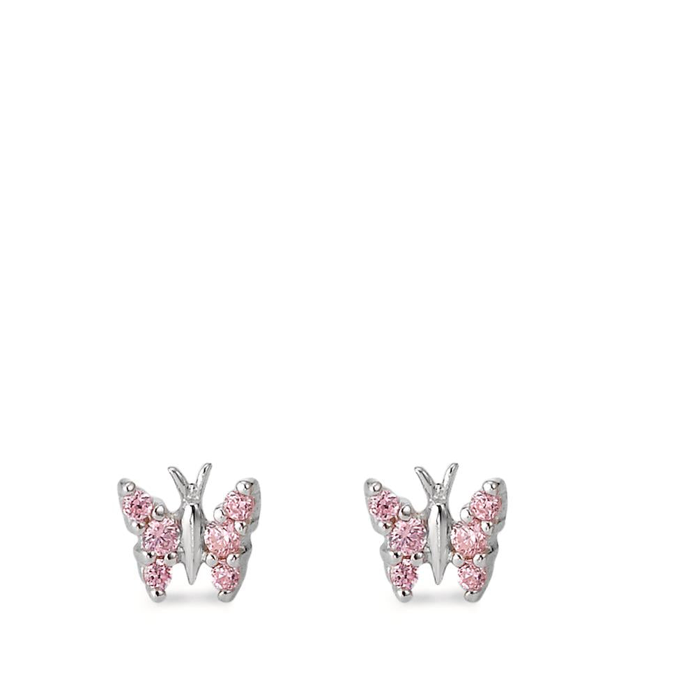 Zauberhafte Ohrstecker für Mädchen aus feinem Silber, verziert mit funkelnden, rosafarbenen Zirkonia-Steinen in Schmetterlingsform. Ein zartes, elegantes Accessoire, das kleinen Kindern schmeichelt und jedem Outfit einen verspielten, glitzernden Akzent verleiht. Ideal auch als Geschenk.