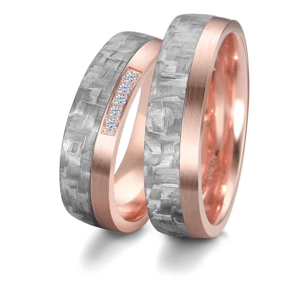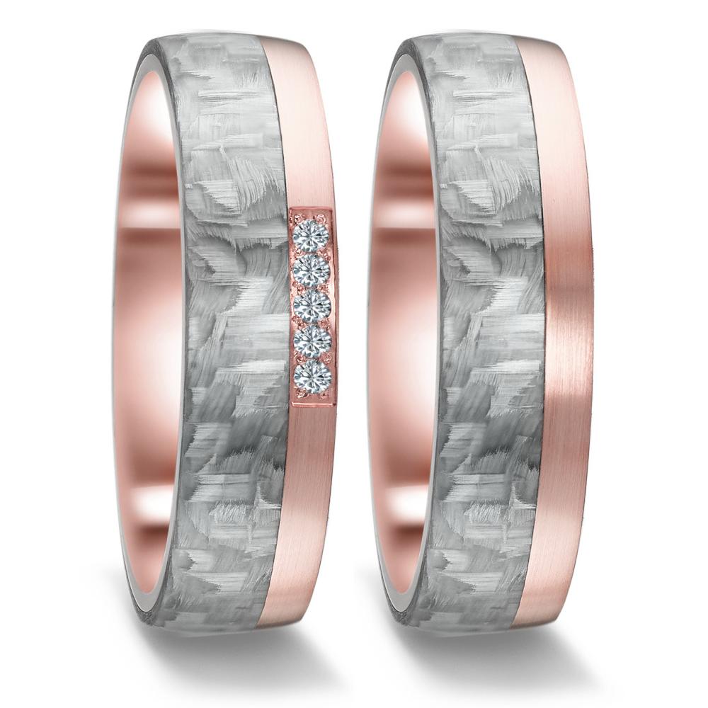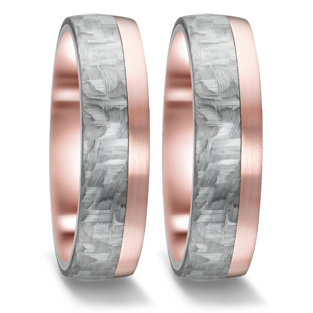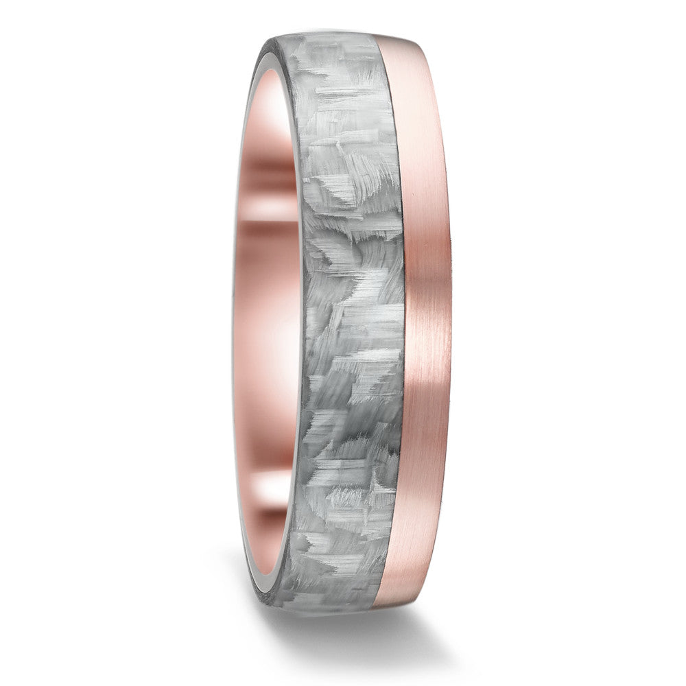 Eleganter Partnerring aus 585er Rotgold und Carbon. Die Kombination aus warmem Roségold und modernem Carbon verleiht dem Ring einen einzigartigen, stilvollen Look. Perfekt für Paare, die zeitlose Eleganz mit einem Hauch von Innovation suchen.
