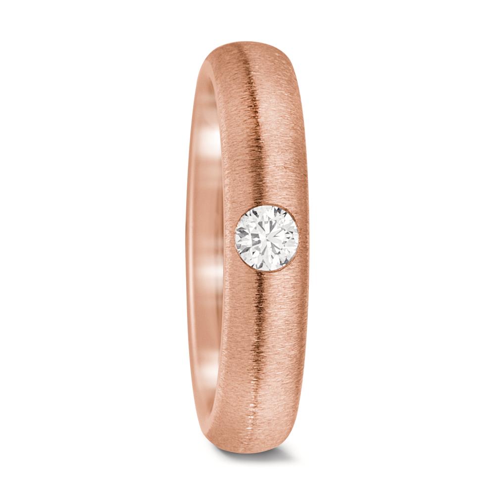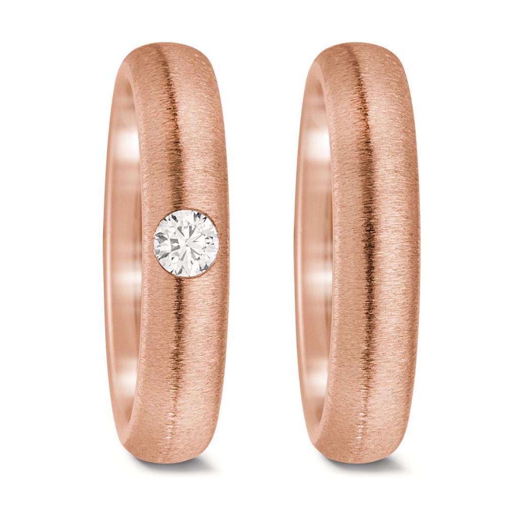 Eleganter Damen-Partnerring aus 750er Rotgold mit feiner, mattierter Oberfläche. Ein strahlender, eingelassener Diamant verleiht dem Ring zeitlose Schönheit und besonderen Glanz – das perfekte Symbol für Liebe und Verbundenheit. Ideal als stilvolles Schmuckstück.