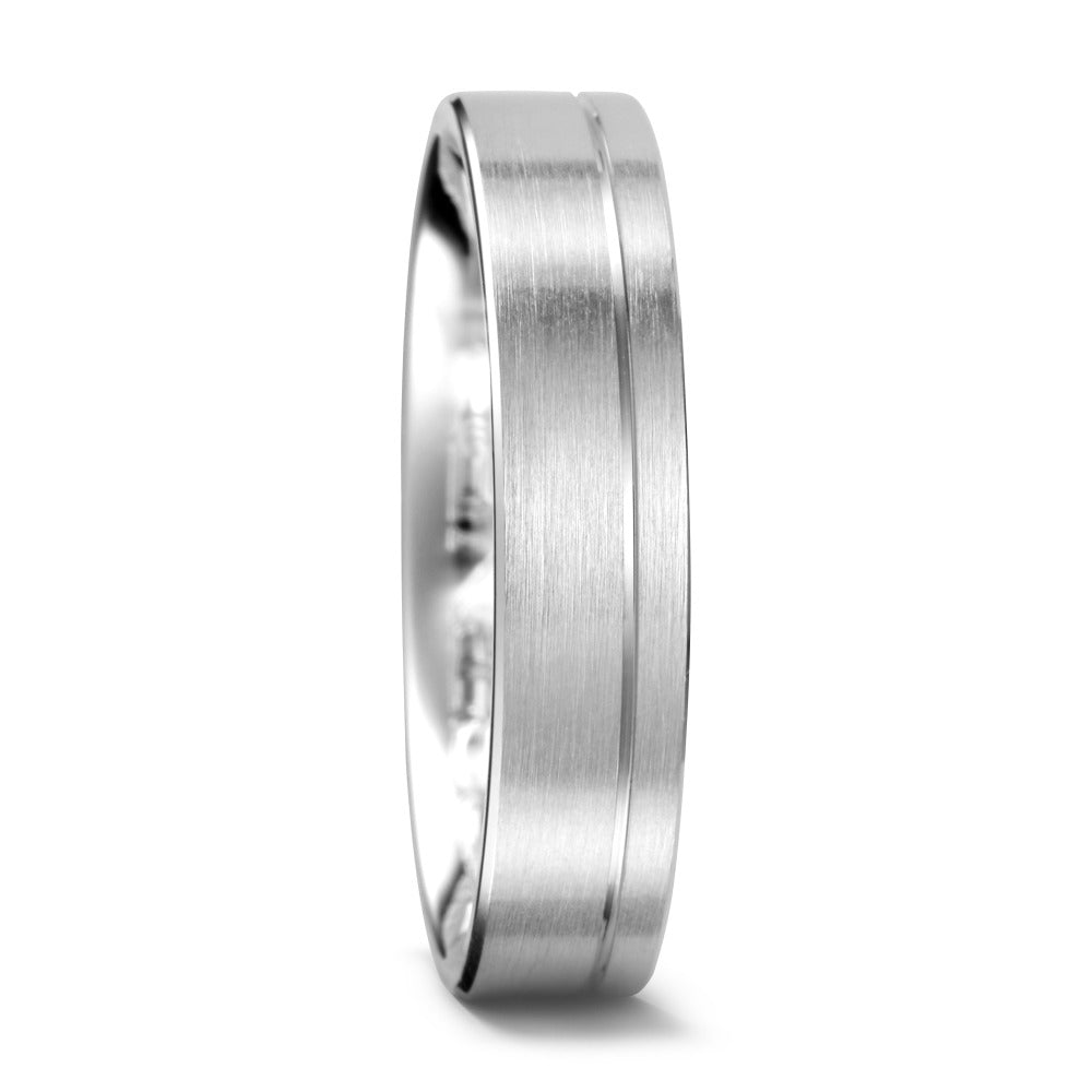 Eleganter Partnerring aus hochwertigem 750er Weissgold mit matter Oberfläche und feiner Rillenverzierung. Schlichtes, zeitloses Design für Paare, die Qualität und Stil verbinden möchten. Perfekt als Symbol für Verbundenheit und gemeinsame Lebenswege.
