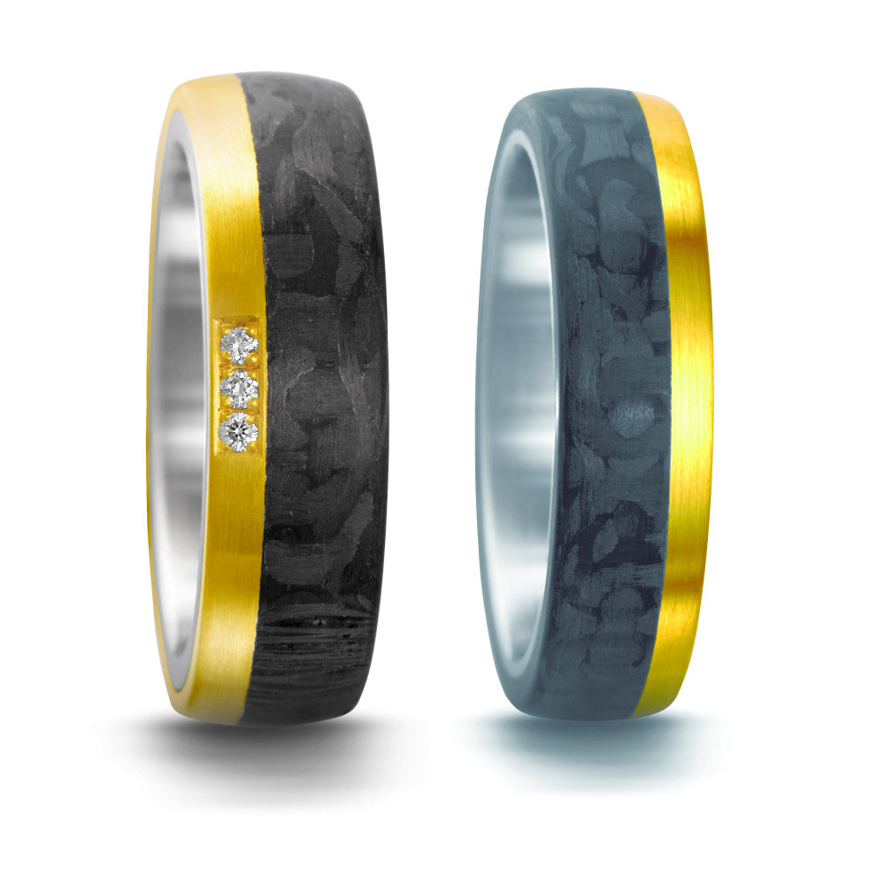 Partnerring Edelstahl, 750/18 K Gelbgold, Carbon Diamant 0.03 ct, 3 Steine, w-si