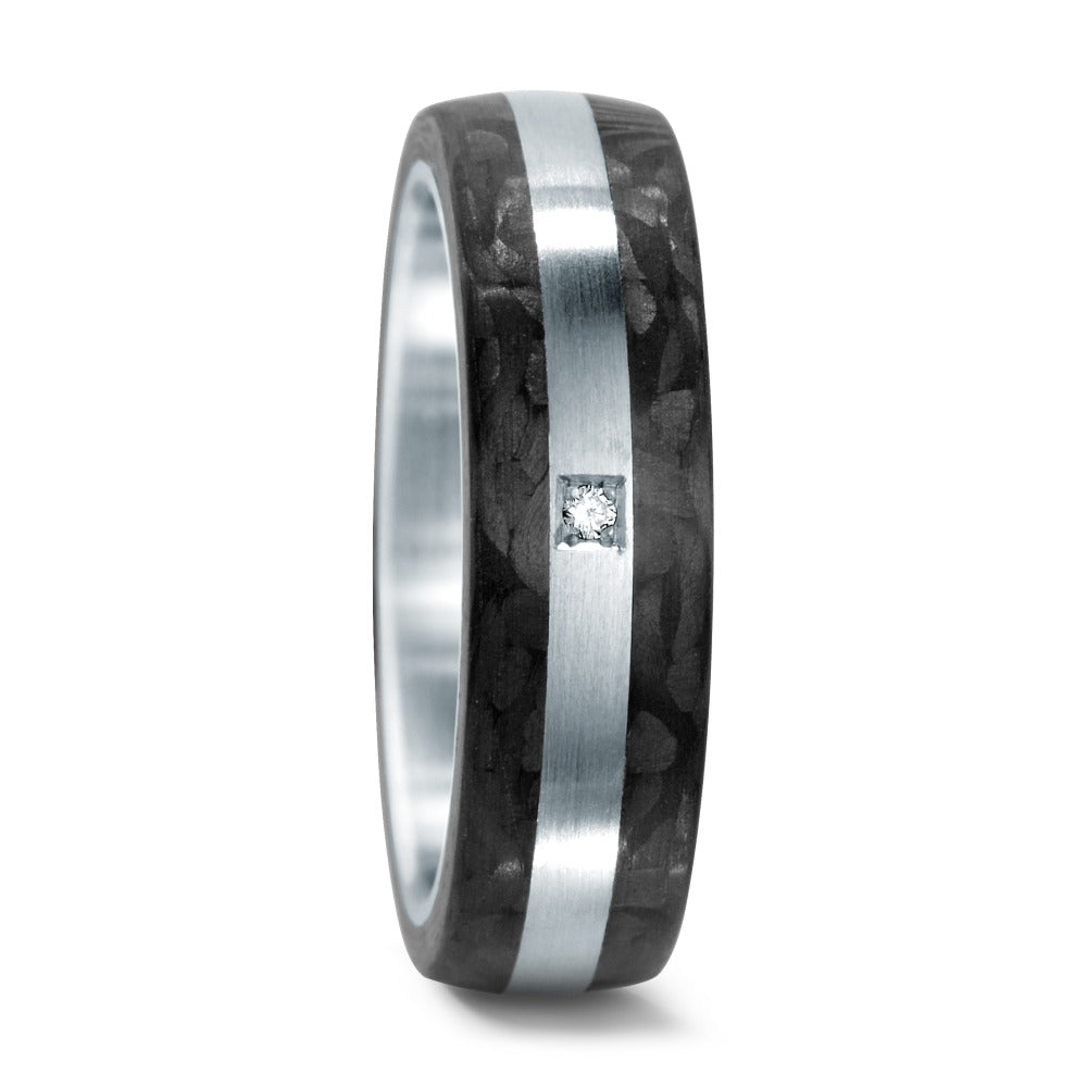 Eleganter Damen Partnerring aus widerstandsfähigem Edelstahl kombiniert mit modernem Carbon. Im Zentrum verläuft ein mattierter Edelstahlstreifen, der durch einen funkelnden Diamanten veredelt wird. Ein zeitloses Schmuckstück für besondere Momente.