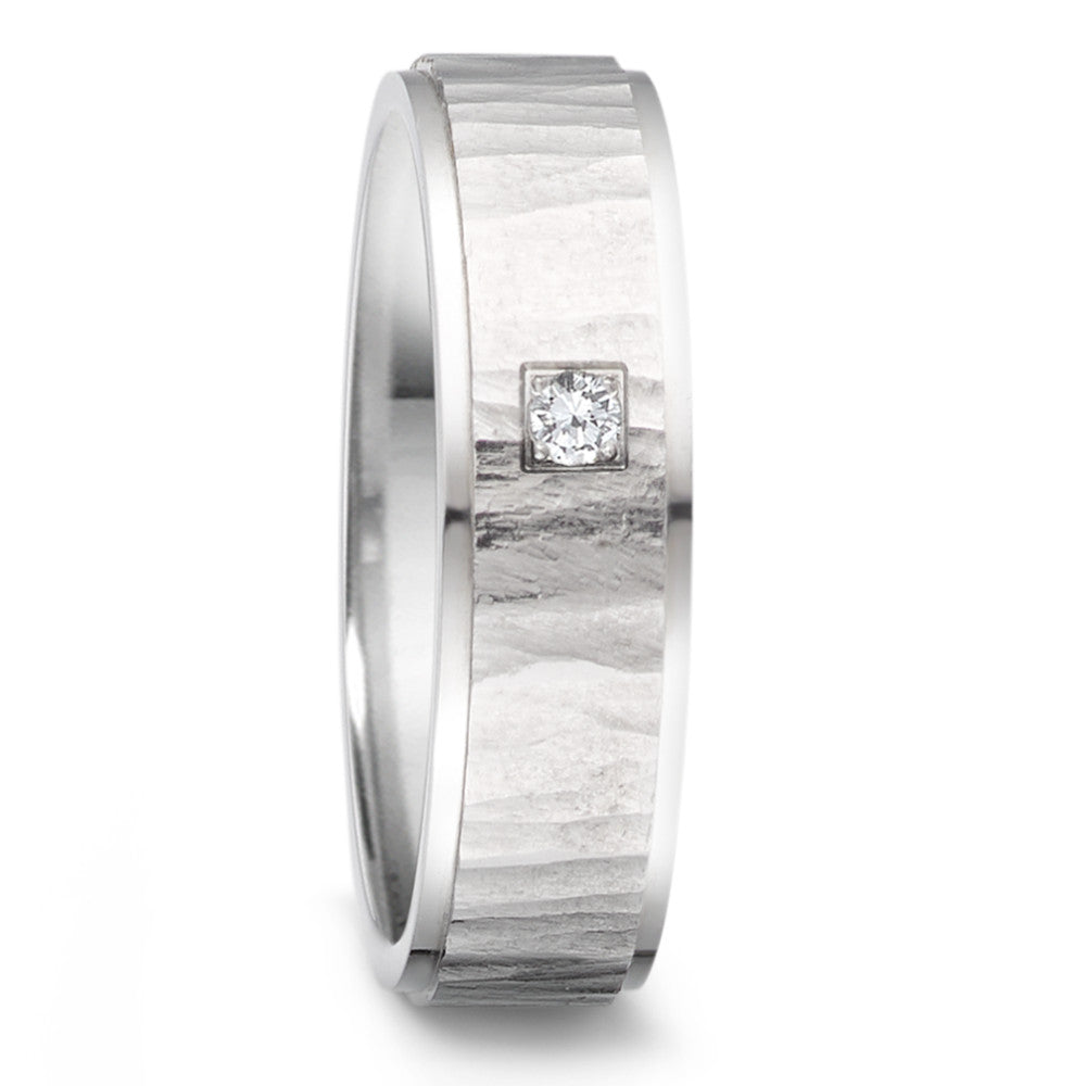 Eleganter Damen-Partnerring aus hochwertigem Edelstahl mit markanter Hammerschlag-Optik. Im Mittelpunkt funkelt ein strahlender Diamant, der dem Ring zeitlose Eleganz und einen besonderen Glanz verleiht. Perfekt als Symbol für Verbundenheit und Liebe.
