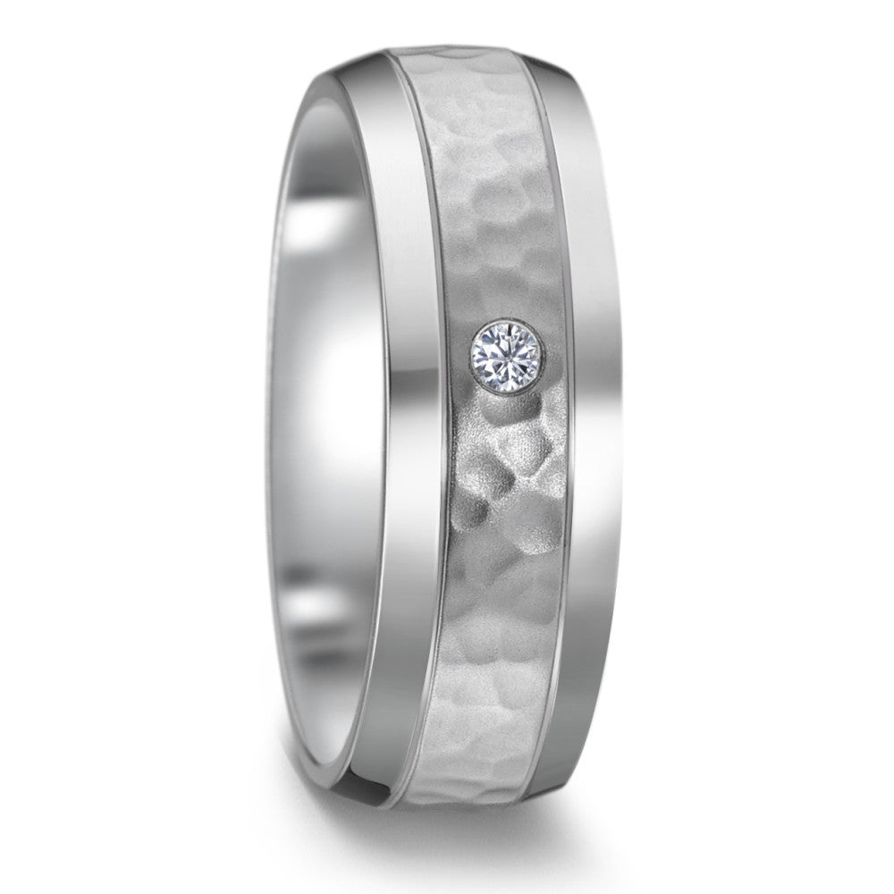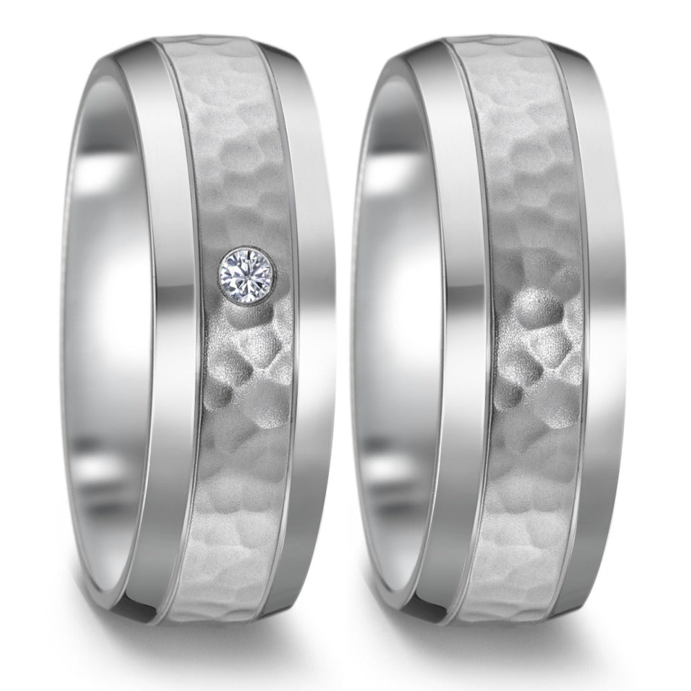 Moderner Damen Partnerring aus hochwertigem Edelstahl mit einer mattierten, gehämmerten Oberfläche. Das elegante Design wird durch einen funkelnden Zirkonia-Stein in der Mitte veredelt. Robustes, langlebiges Schmuckstück für besondere Momente.