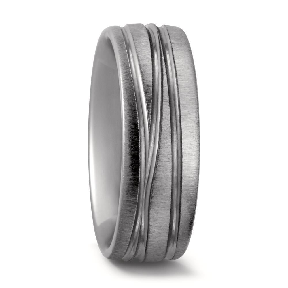 Moderner Titan-Partnerring mit markanter Linienführung in gebürstetem Finish. Der hochwertige, robuste Werkstoff garantiert Langlebigkeit und hohen Tragekomfort. Ein stilvoller Begleiter für alle, die zeitlose Eleganz und besondere Wertigkeit schätzen.