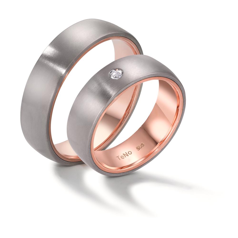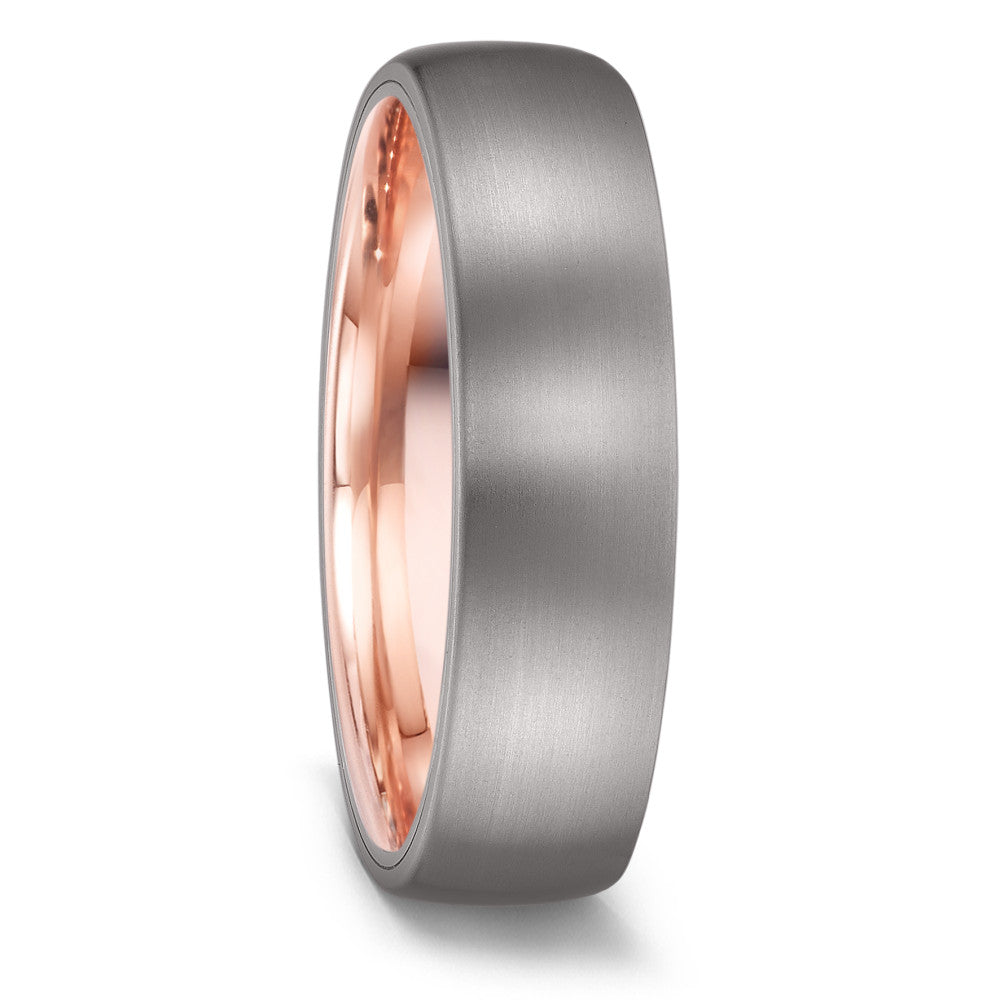 Eleganter Partnerring aus widerstandsfähigem Titan mit einer edlen Innenverarbeitung aus 585er Rotgold. Die Kombination aus mattem Titan aussen und warmem Rotgold innen verleiht dem Ring ein modernes und zugleich zeitloses Design – perfekt für symbolische Verbindungen.