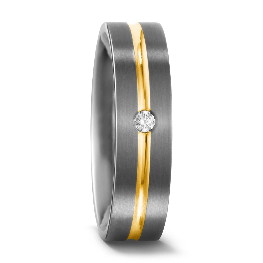 Eleganter Damen-Partnerring aus robustem Titan mit einer feinen, mittig verlaufenden Linie aus 750er Gelbgold. Veredelt wird das Design durch einen funkelnden Diamanten, der zeitlose Schönheit und moderne Eleganz vereint – perfekt für besondere Momente und die Liebe fürs Leben.