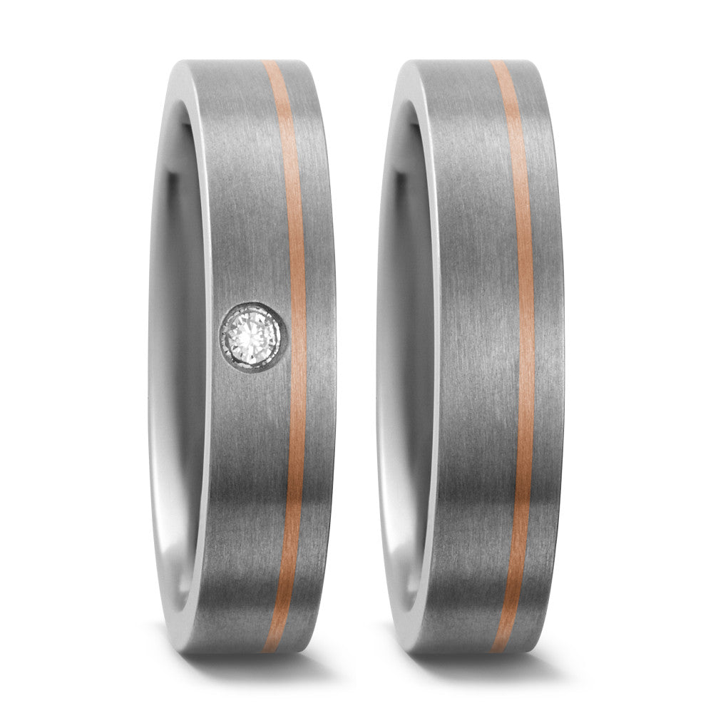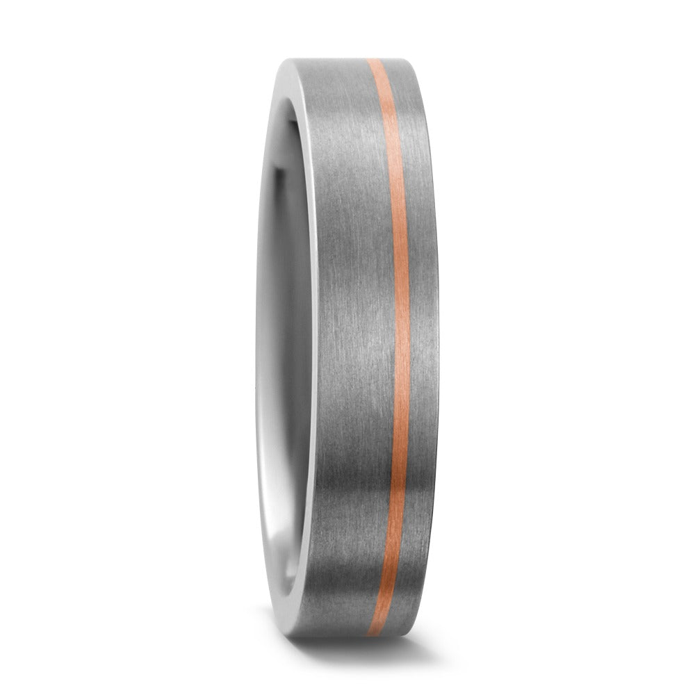 Moderner Partnerring aus robustem Titan mit einem edlen Streifen aus 750er Rotgold. Die matte Oberfläche verleiht dem Ring einen zeitlosen, stilvollen Look. Perfekt für Paare, die Qualität und Design in einem accessoire vereinen möchten. Komfortabel und langlebig.