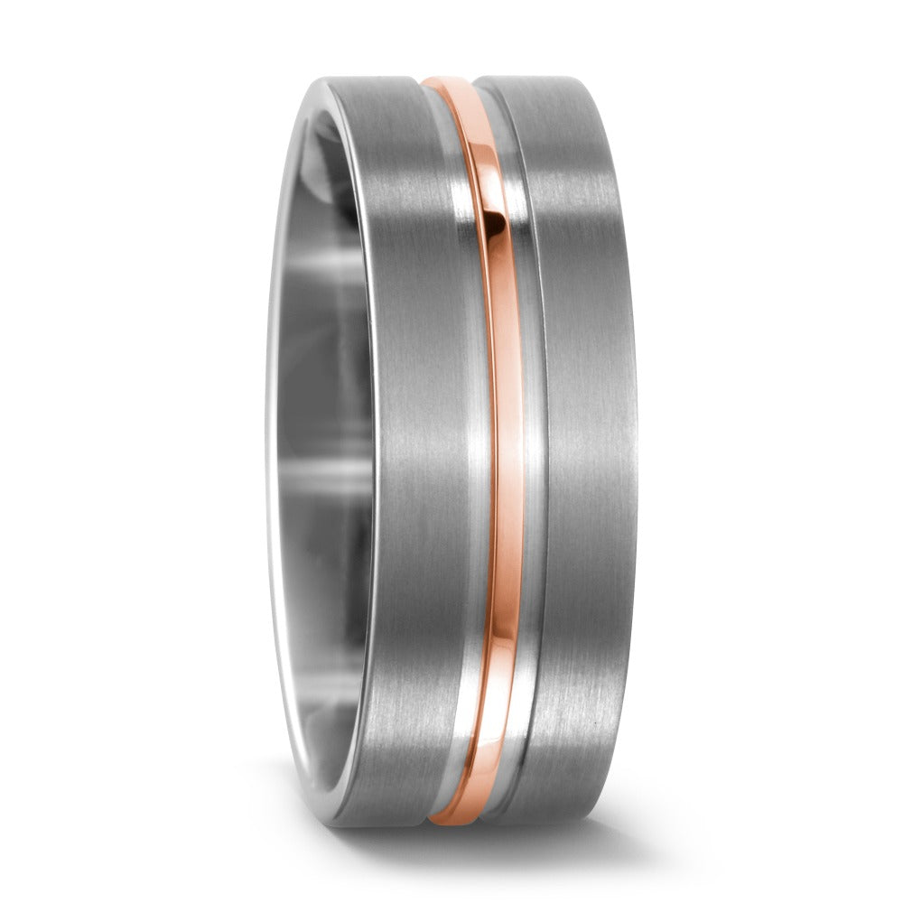 Edler Partnerring aus widerstandsfähigem Titan mit einem eleganten 750er Rotgold-Band in der Mitte. Modernes, matt gebürstetes Design für Herren und Damen, perfekt als Symbol für Verbindung und Liebe. Hoher Tragekomfort und langlebige Qualität zeichnen diesen Ring aus.