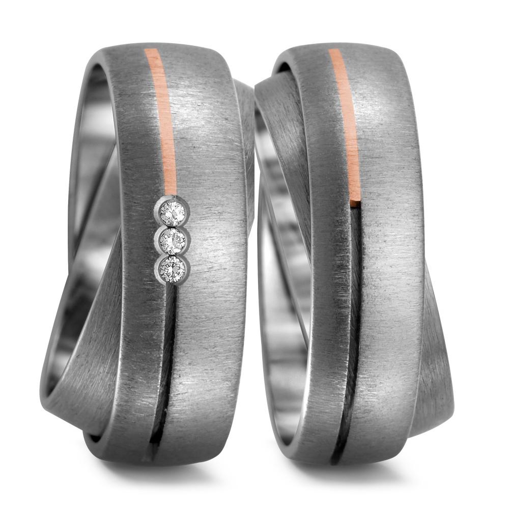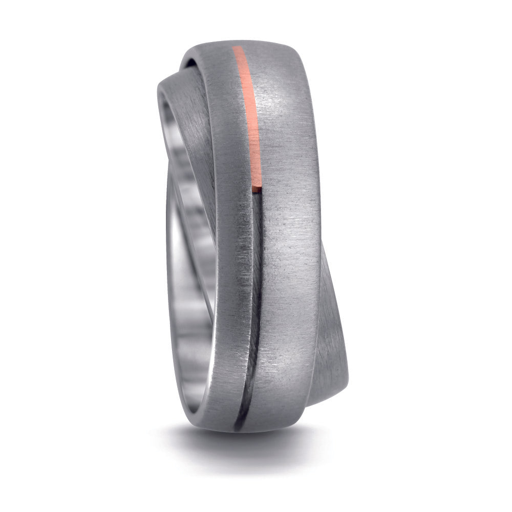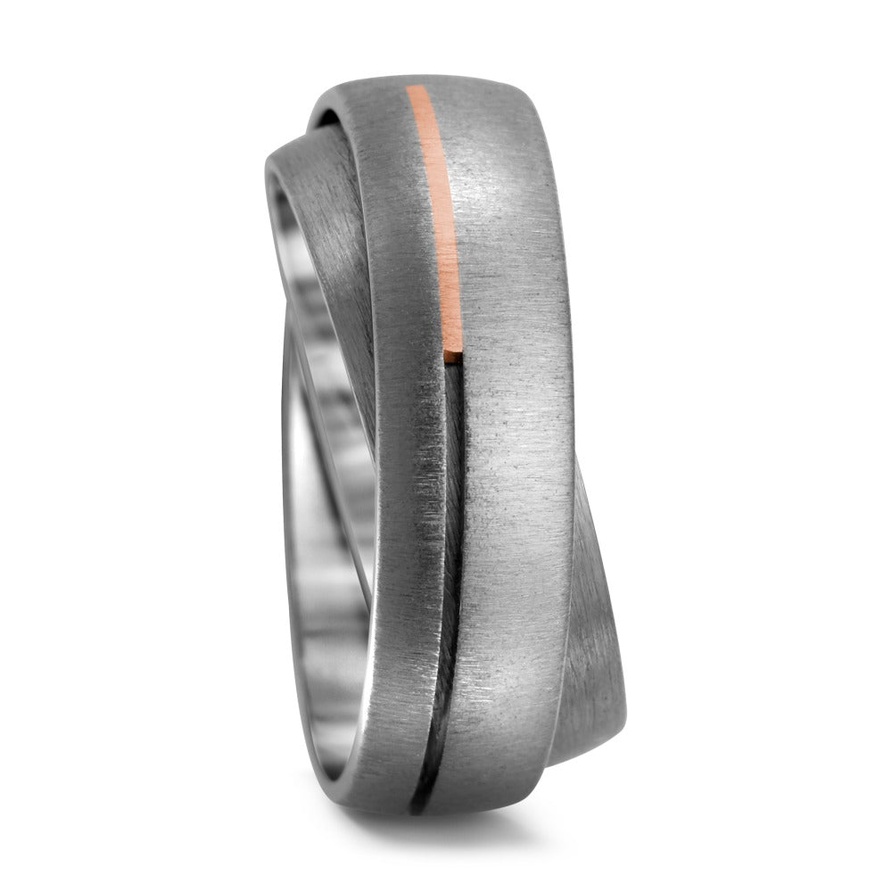Moderner Partnerring aus robustem Titan mit edlem 750er Rotgold-Akzent. Die matte Oberfläche und das einzigartige Design symbolisieren Verbundenheit und Stilbewusstsein. Perfekt für Paare, die eine langlebige und elegante Verbindung suchen. Komfortabel und zeitlos schön.