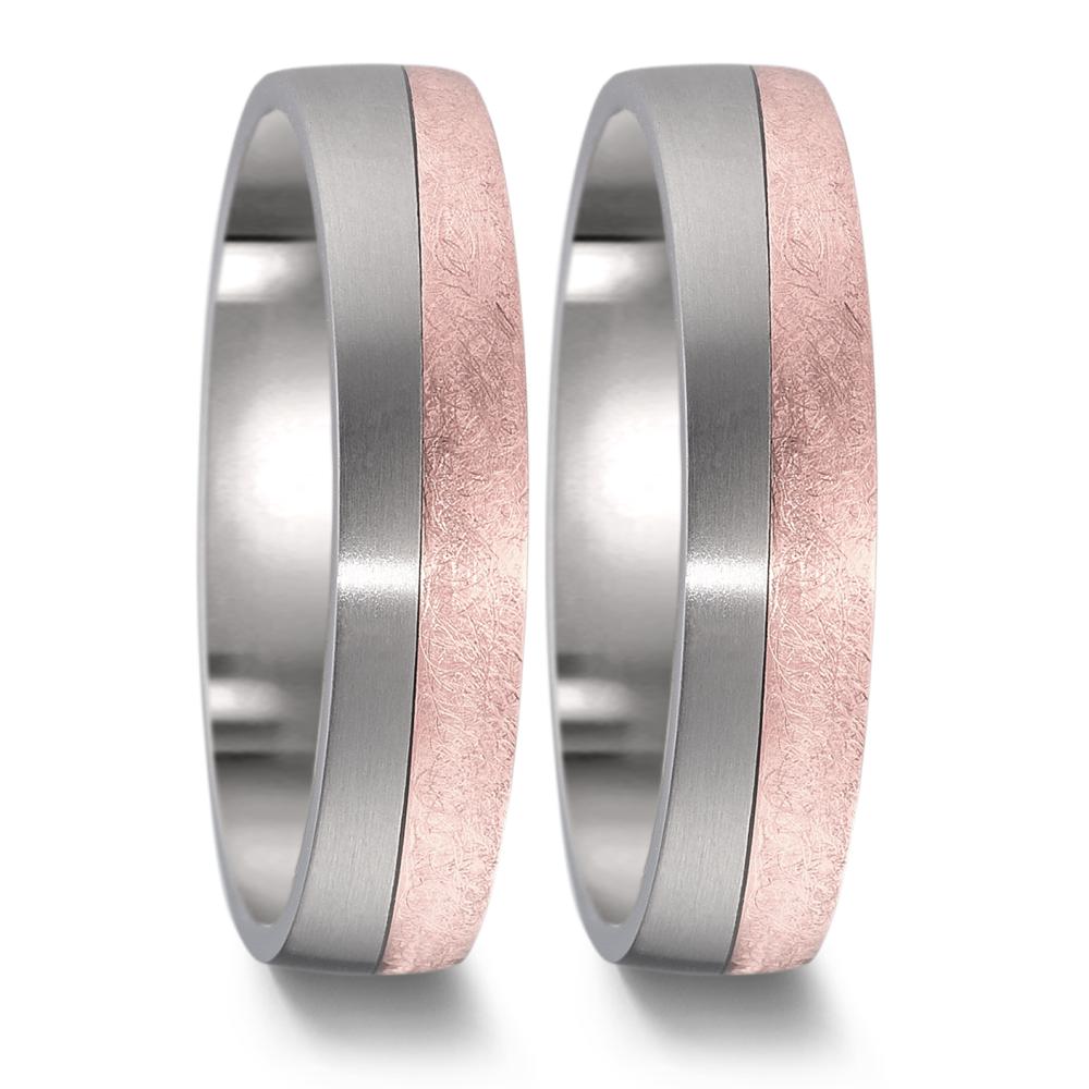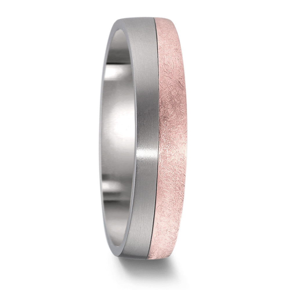 Eleganter Partnerring aus robustem Titan, veredelt mit einer edlen 750 Rotgold-Applikation. Das moderne Design vereint beständige Materialien und stilvolle Farbakzente, perfekt für Paare, die zeitlose Eleganz mit besonderer Symbolik suchen. Ideal für jeden Anlass.