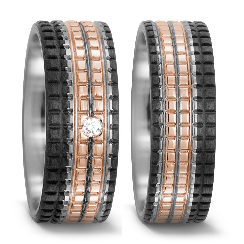 Moderner Partnerring aus robustem Titan und edlem Carbon mit eleganten Akzenten aus 750er Rotgold. Das Design verbindet Stärke und Stil zu einem besonderen Schmuckstück, das Liebe und Verbundenheit symbolisiert. Perfekt für Paare, die das Besondere suchen.