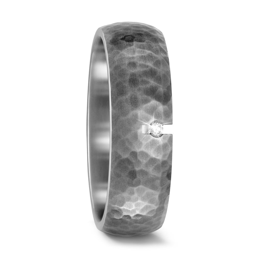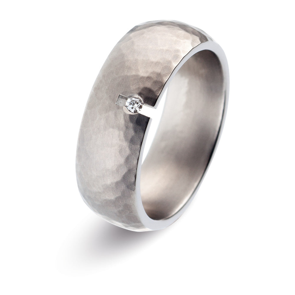 Moderner Damen Partnerring aus robustem Titan mit markanter Hammerschlag-Oberfläche. Ein funkelnder Diamant setzt einen eleganten Akzent im individuellen Schlitzdesign. Perfekte Kombination aus zeitlosem Stil und langlebigem Material für besondere Momente.